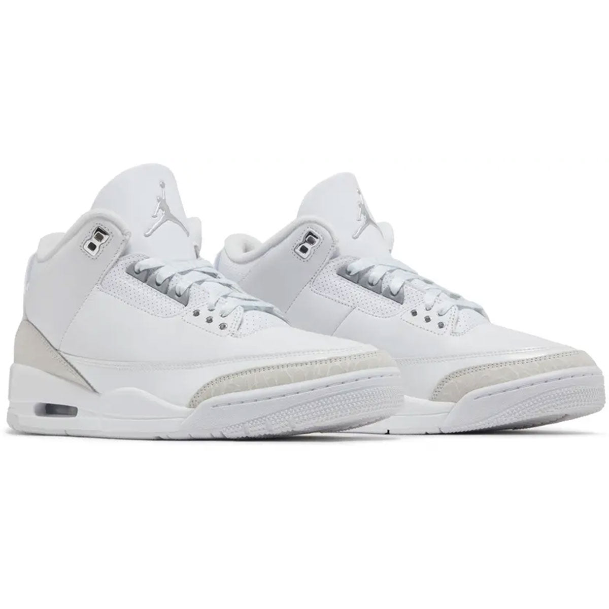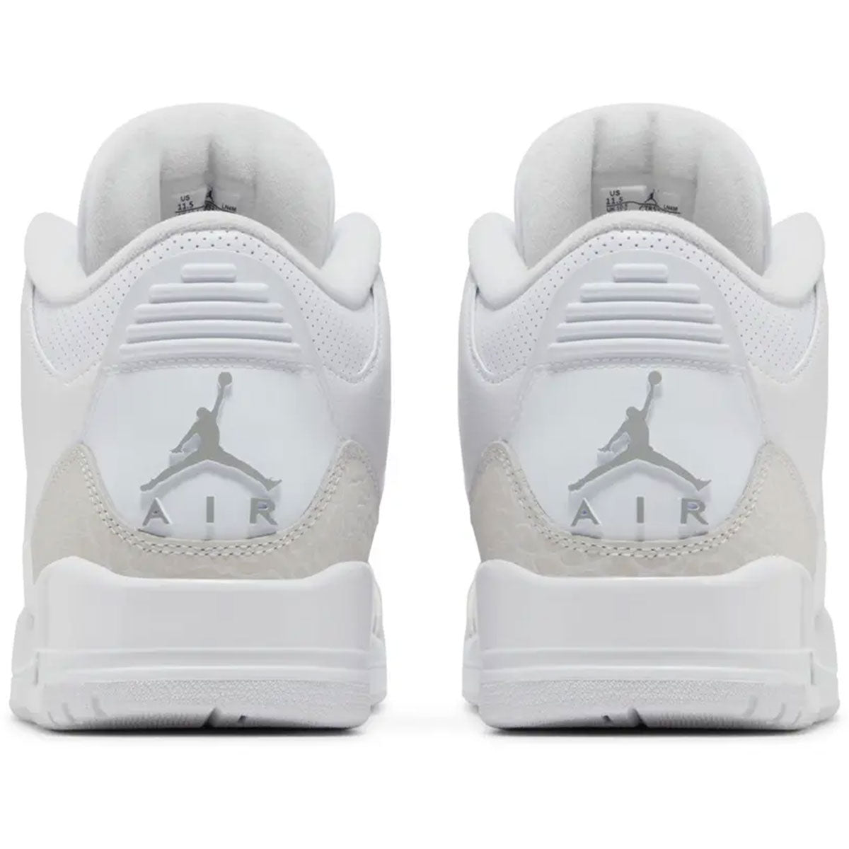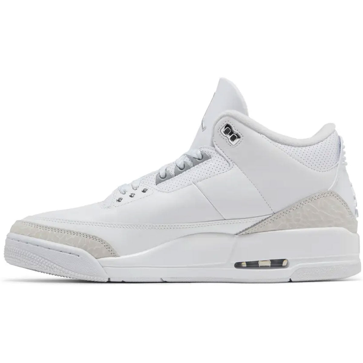 This Air Jordan 3 Retro features a white tumbled leather base with elephant print overlays and silver accents throughout.