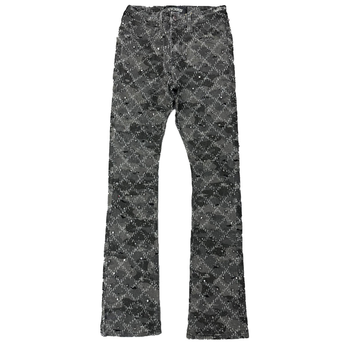These grey jeans from Vicious feature a flared look with heavy rhinestone embellished details throughout.