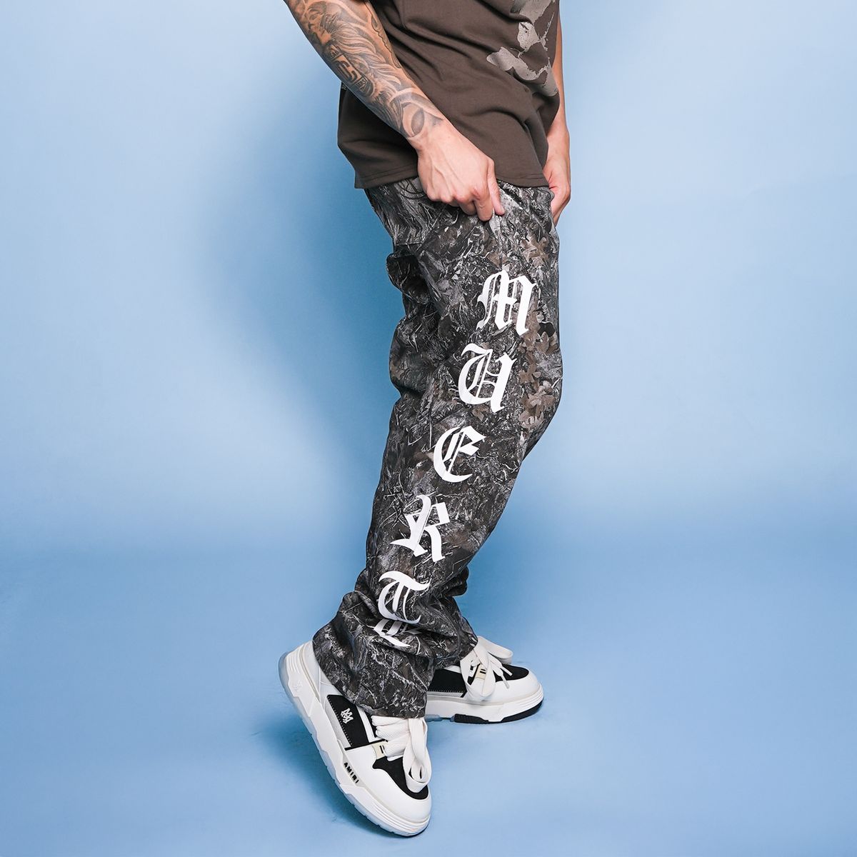 These pants from Hasta Muerte feature an intricate camo print with classy letters on sides.