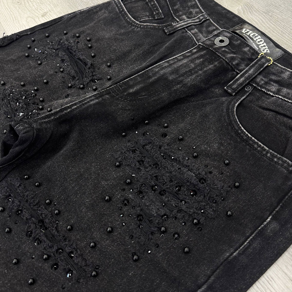 These black jeans from Vicious feature multiple stone details with distresses on both sides.