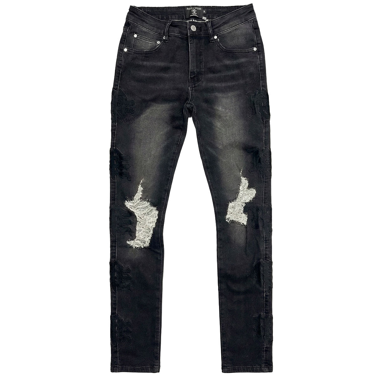 These regular rise, midnight wash jeans from Mixed Emotion feature aggressive rips on front and multiple monogram details on both front and rear.