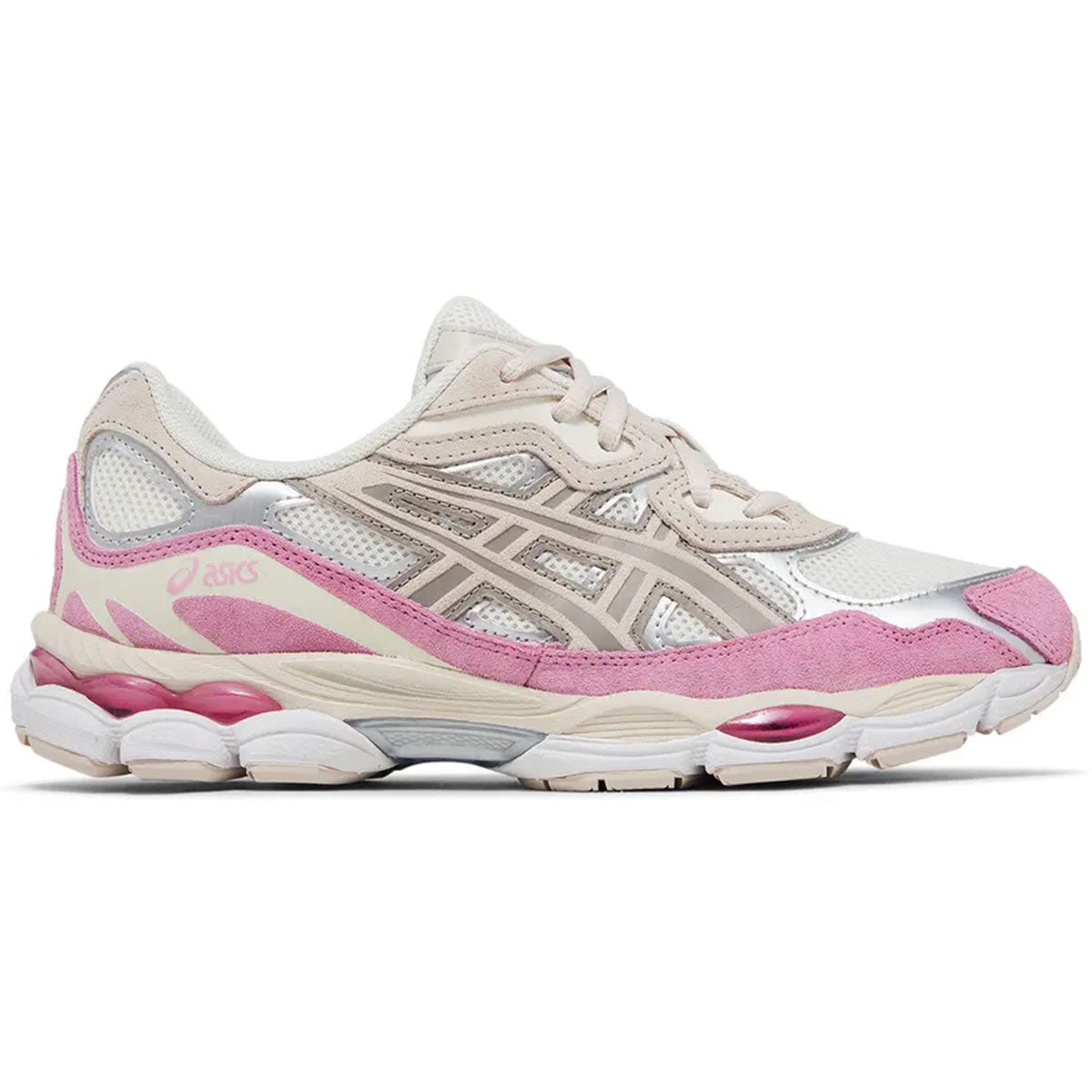 This Asics Gel NYC features a cream mesh upper with grey, white, and pink overlays in different materials and textures.
