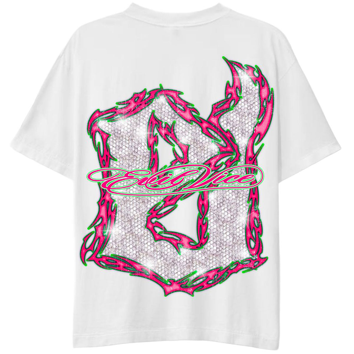 This white t-shirt from EVIL VICE features a teeth tribal green and pink graffiti graphic with branding on front and a matching chrome pink logo graphic on rear.