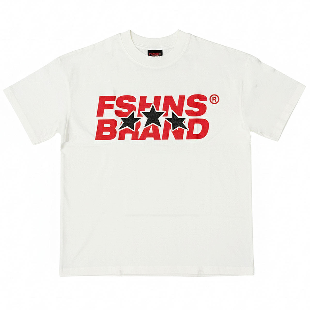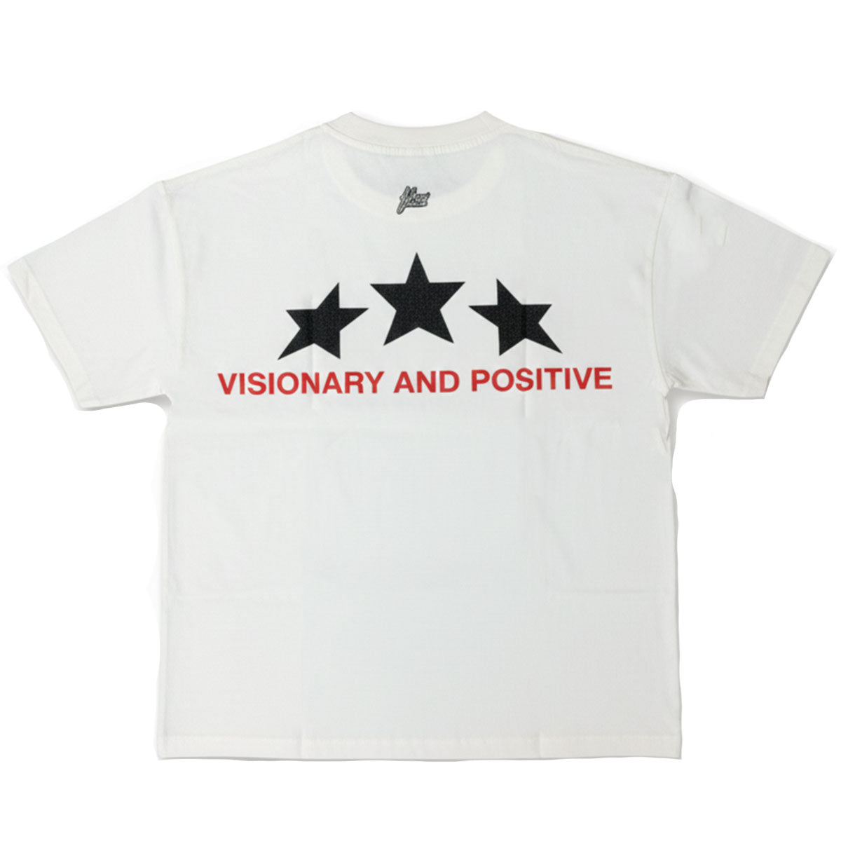 This cream t-shirt from FSHNS Brand features a large black glitter 3 Star graphic with a red branded logo graphic on front and a matching glitter star graphic on rear with a 'Visionary and Positive' slogan.