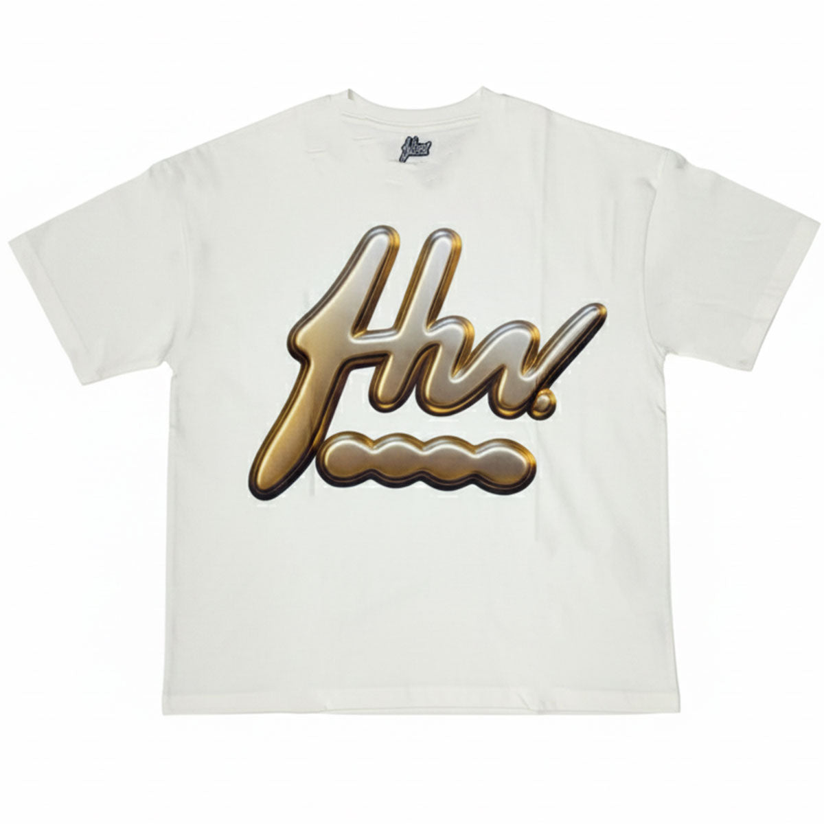 This vanilla cream t-shirt from FSHNS Brand features a golden metallic logo on front and a large matching logo with a small silicone logo patch on rear.