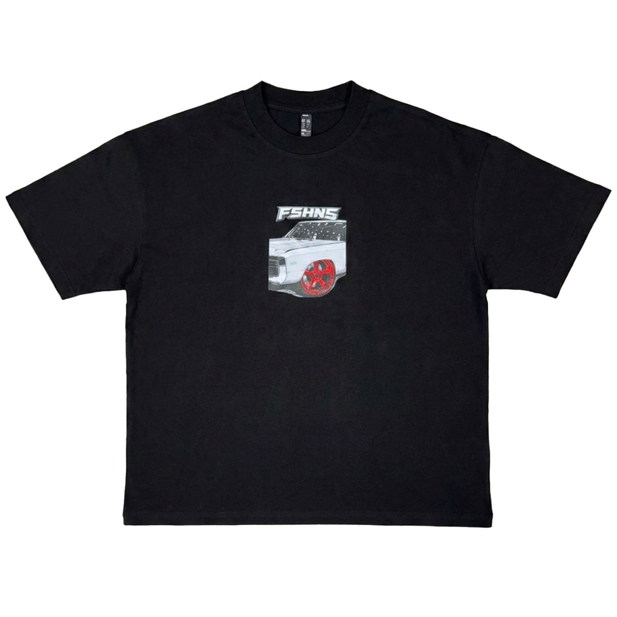 This black t-shirt from FSHNS Brand features a classic car graphic with logo on front and a large matching graphic on rear.
