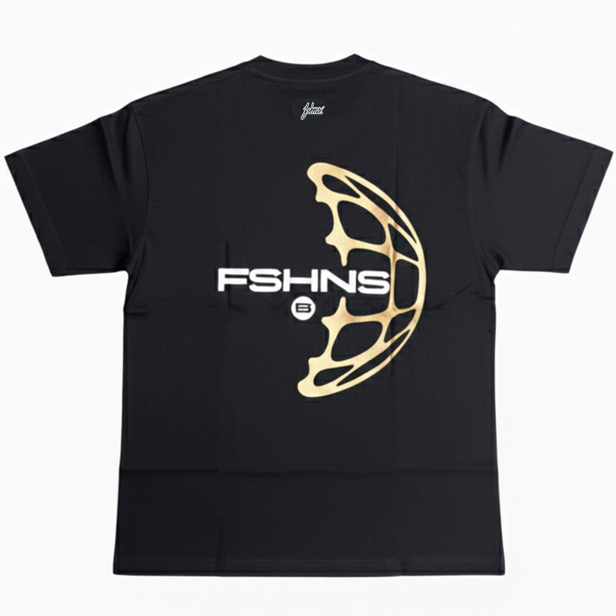 This black t-shirt from FSHNS Brand features a small branded logo on front and a large gold globe graphic with a silicone logo patch.