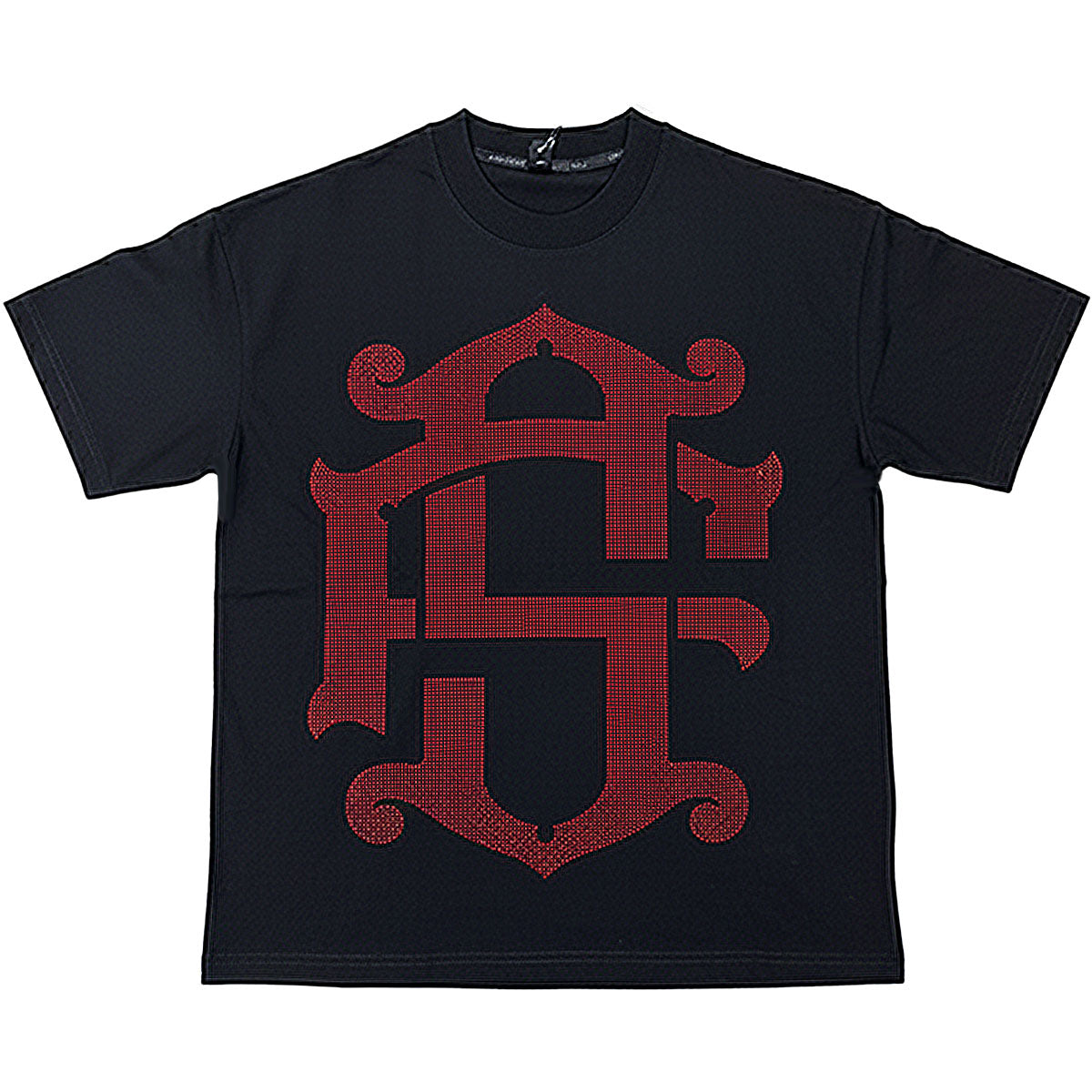This black oversize t-shirt from FSHNS Brand features a red rhinestone monogram graphic on front with a small silicone logo patch on rear.