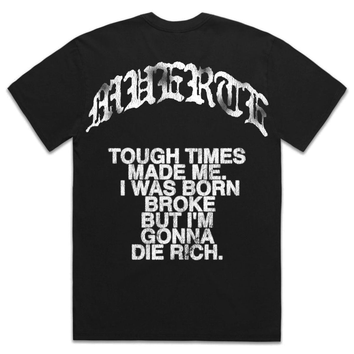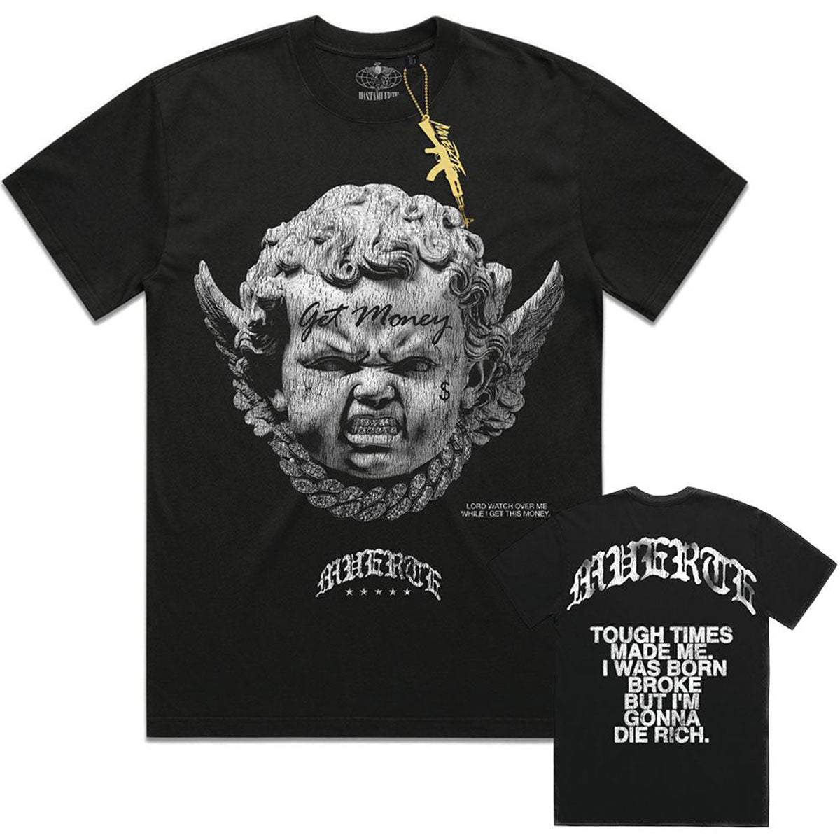 This faded black t-shirt from Hasta Muerte features a large metal angel grilll graphic with branding on front, a rear slogan graphic, and a custom AK hangtag.