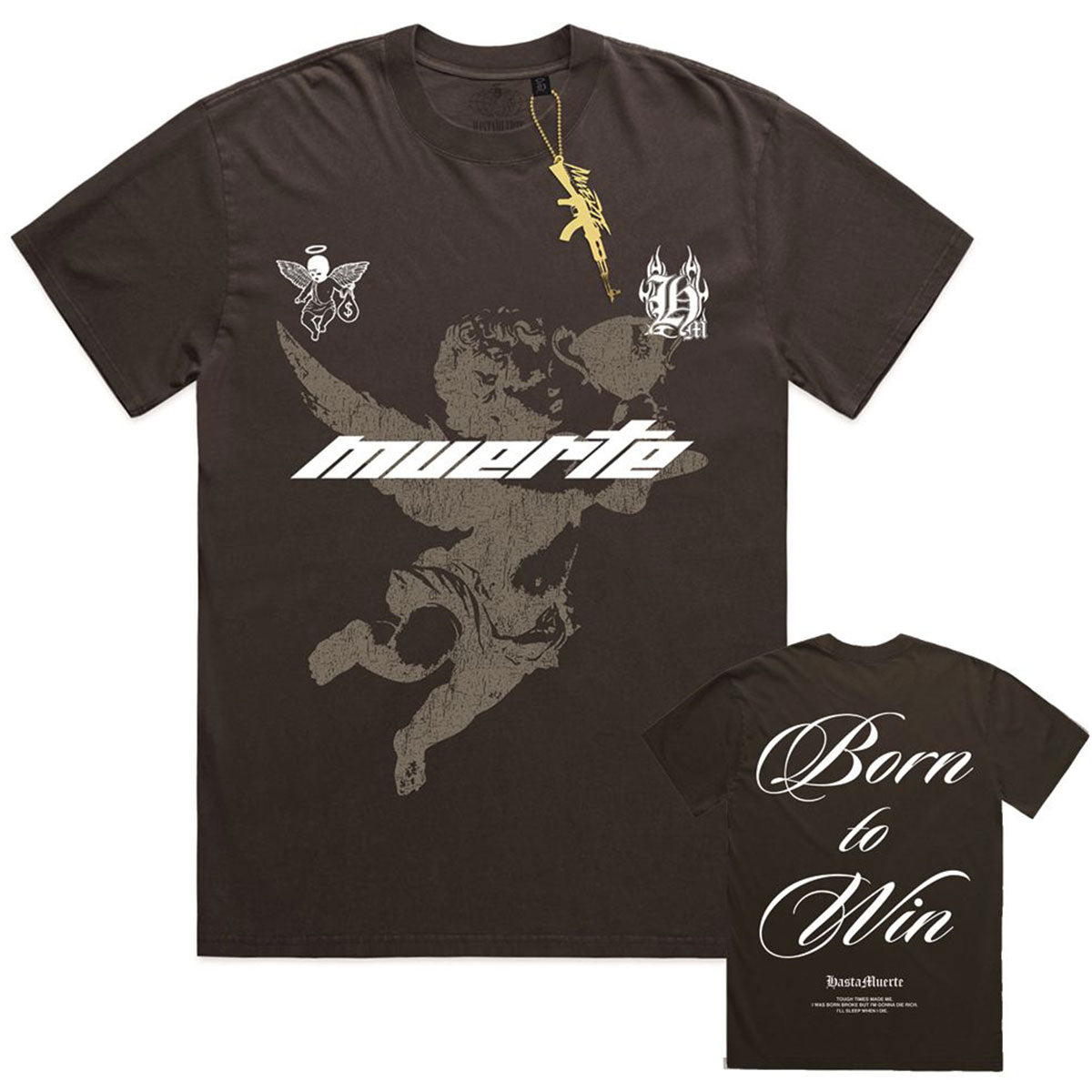 This Java brown t-shirt from Hasta Muerte features a large angel graphic with branding on front, a scripted slogan graphic on rear, and a custom AK hangtag.