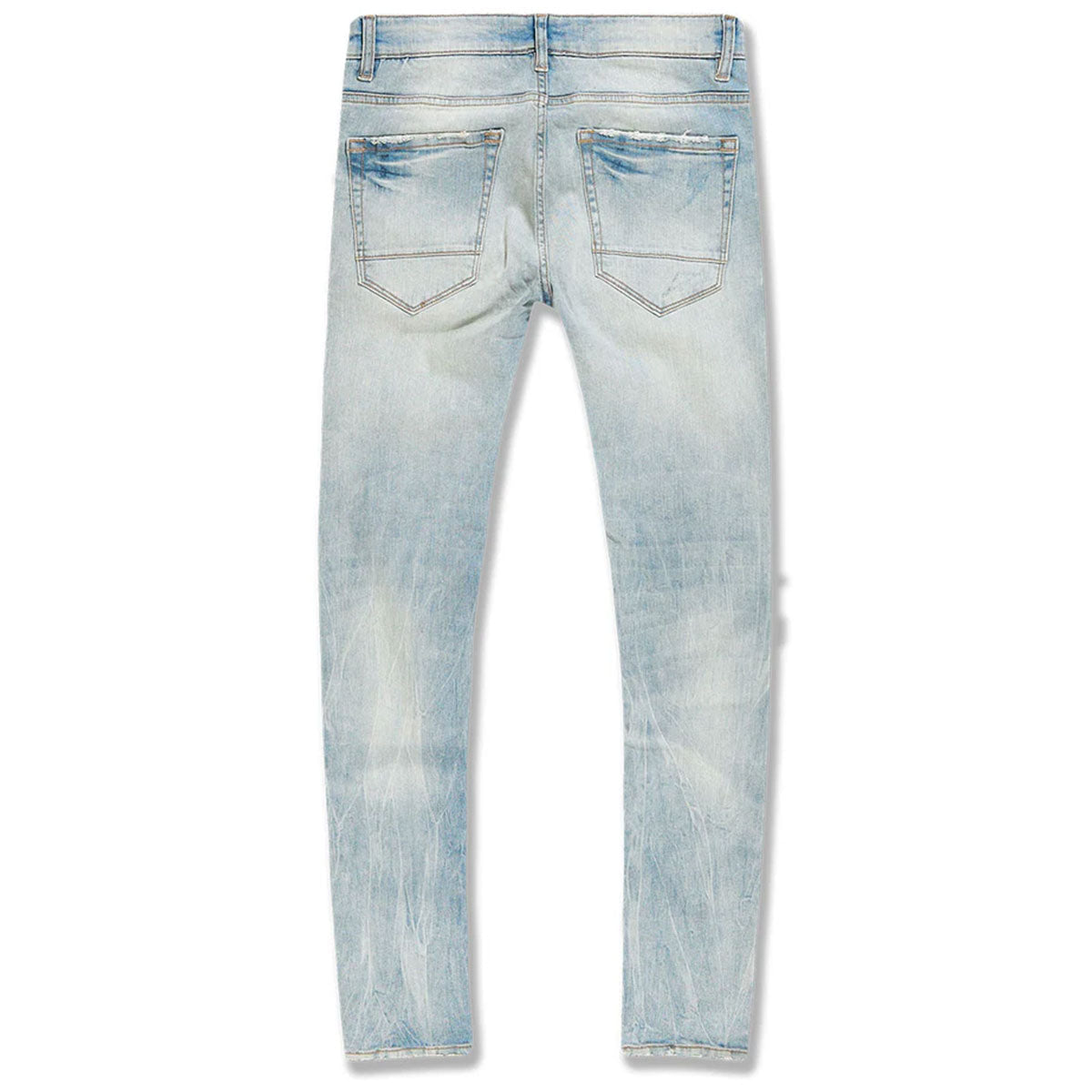 This regular rise, iced lager jean from Jordan Craig features tight tapering from knee to ankle, rip & repair design with fused shreds, unique distresses, and a vintage look.