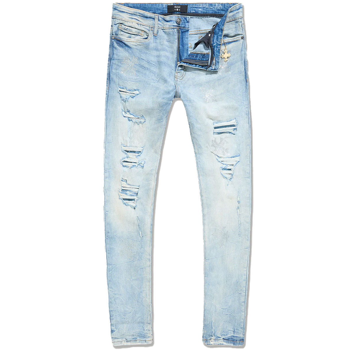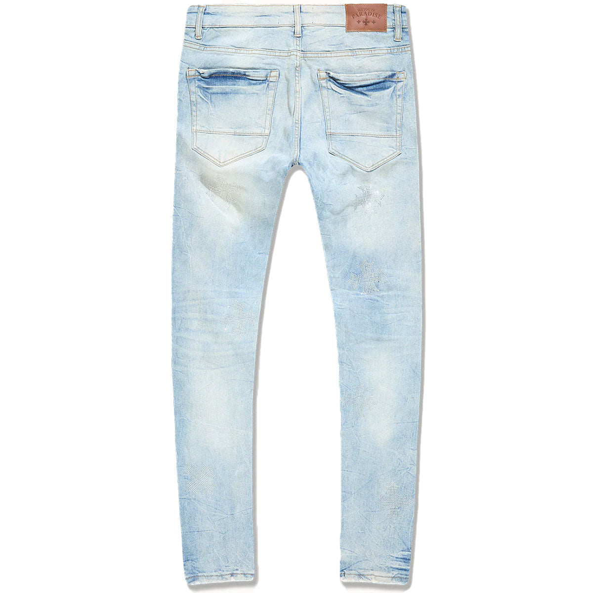 These regular rise, antique wash pants from See You in Paradise feature a slim taper fit, comfort fit from waist to thigh, comfortable tapering from knee to ankle, rhinestone detailing throughout, 3D baked wrinkles, rip & repair design with raw denim backing, and a super stretch fit.