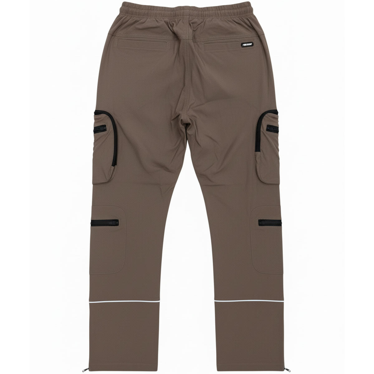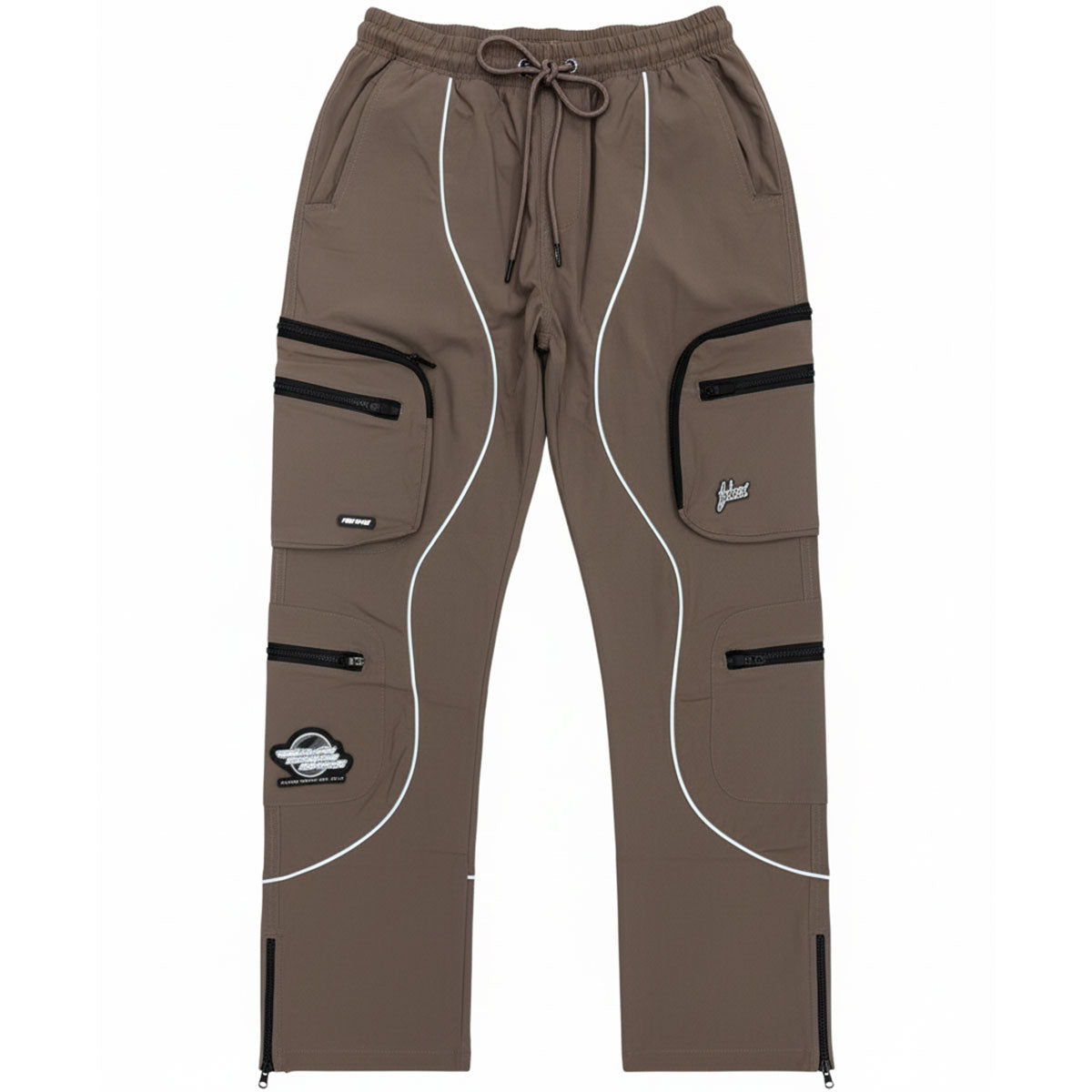These coffee brown pants from FSHNS Brand feature a baggy fit with multiple cargo pockets, silicone logo details, reflective piping, rear pockets, and an adjustable drawcord at waist.