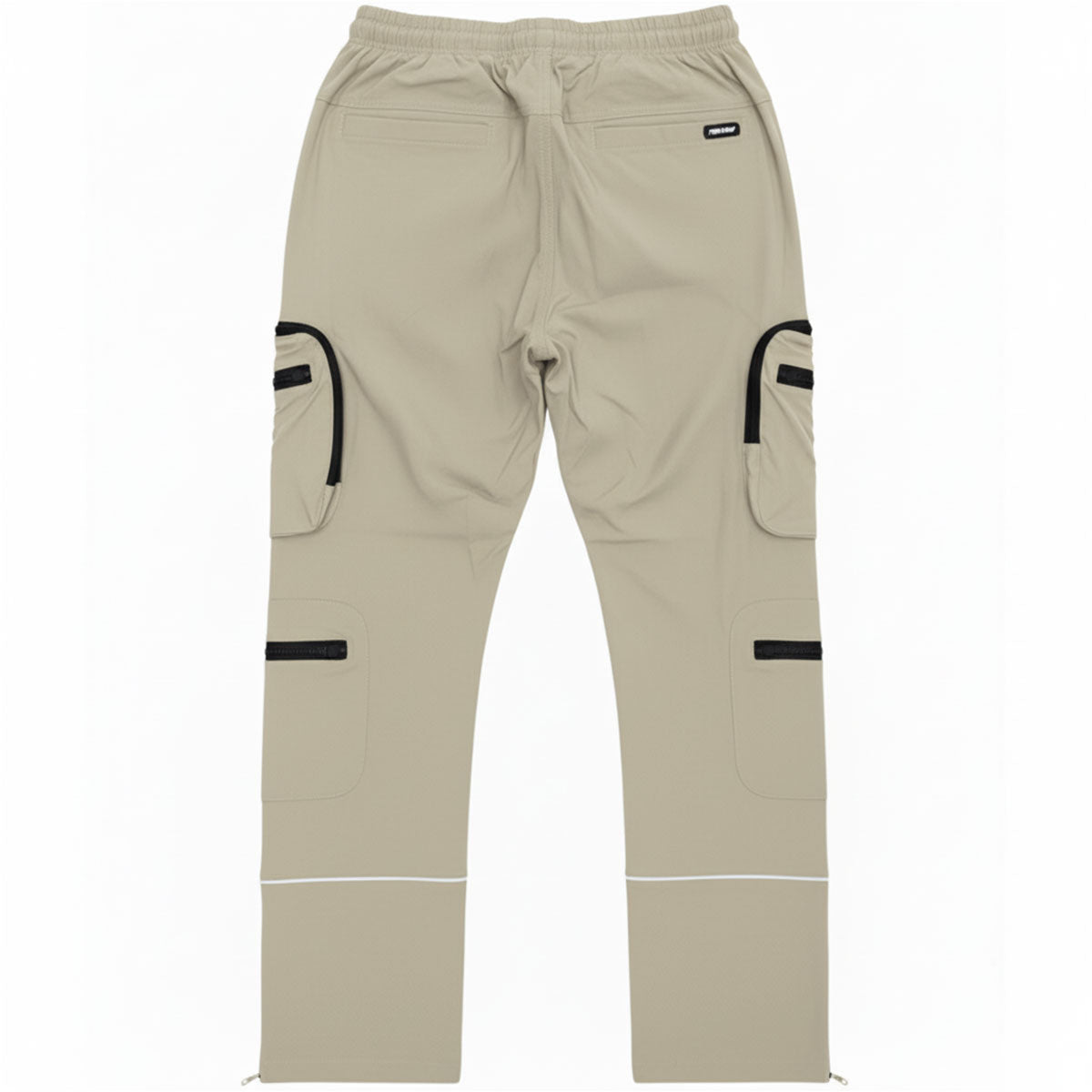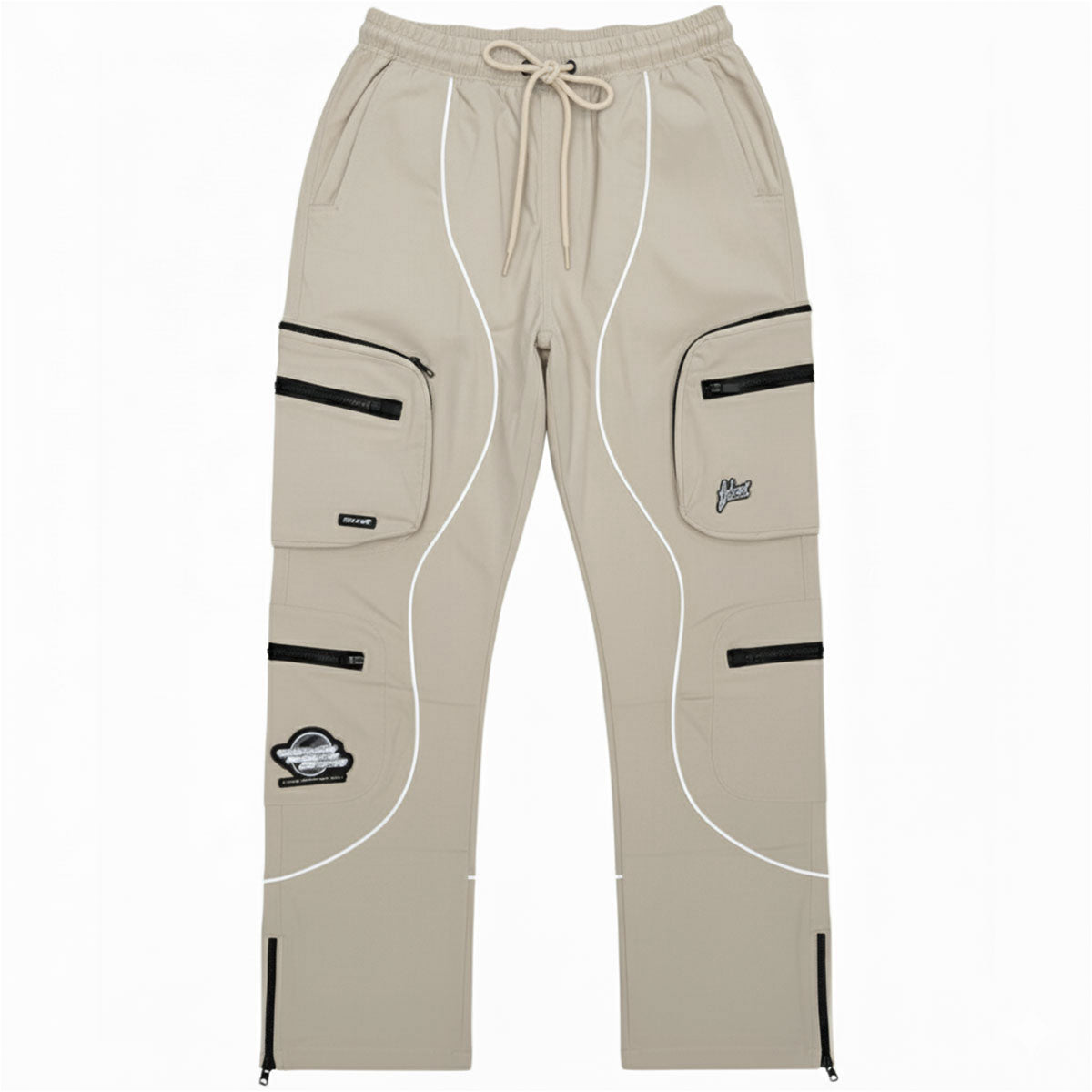 These khaki pants from FSHNS Brand feature a baggy fit with multiple cargo pockets, silicone logo details, reflective piping, rear pockets, and an adjustable drawcord at waist.