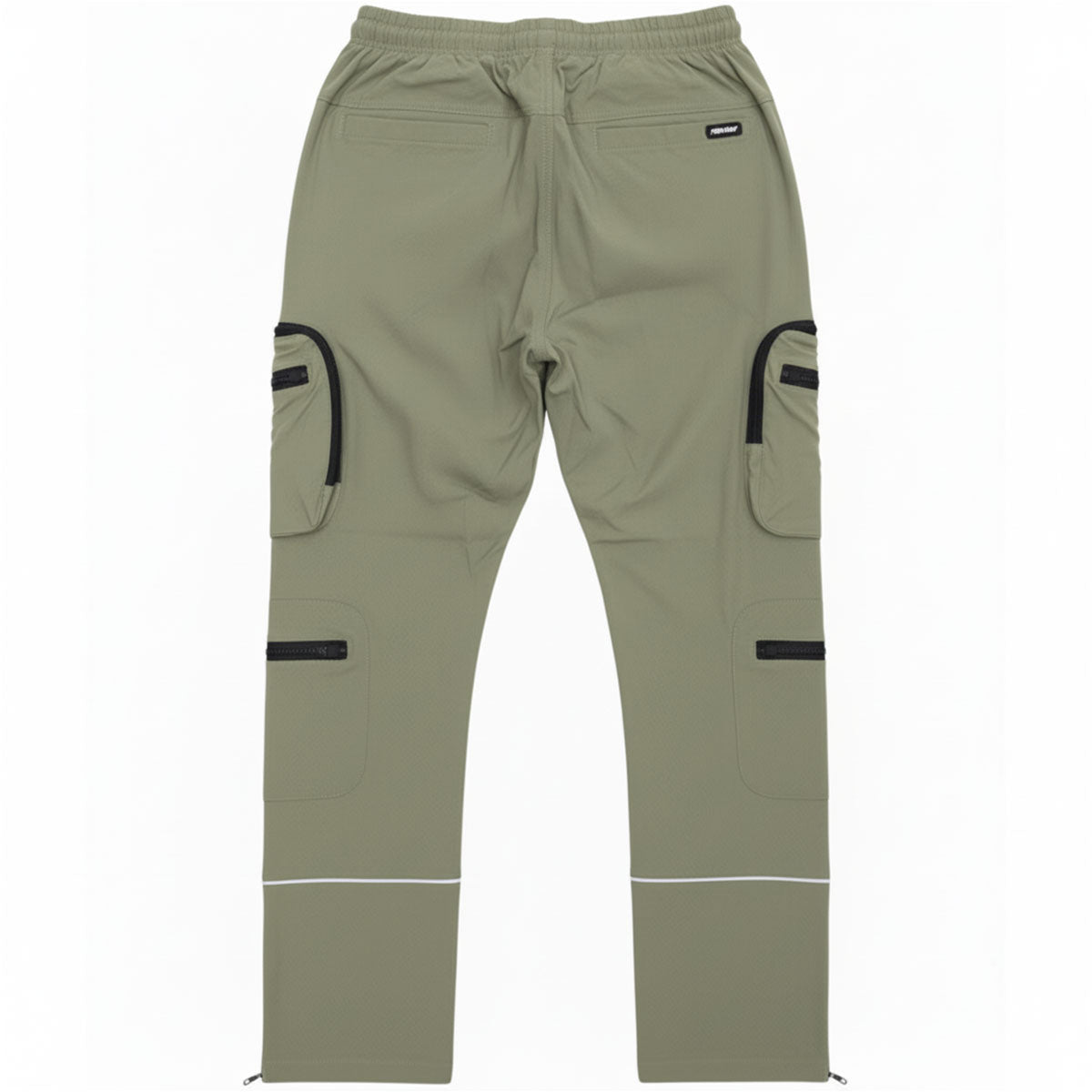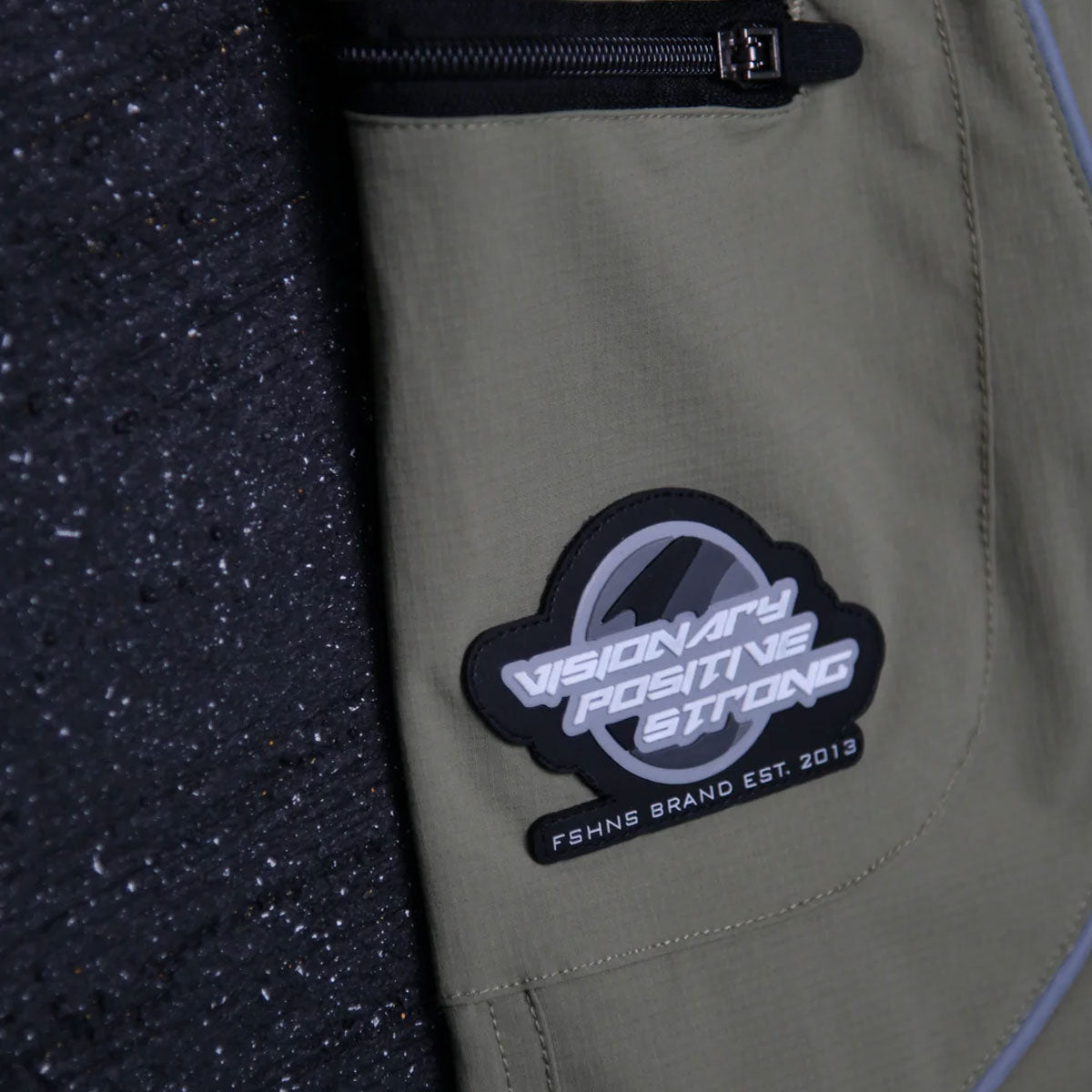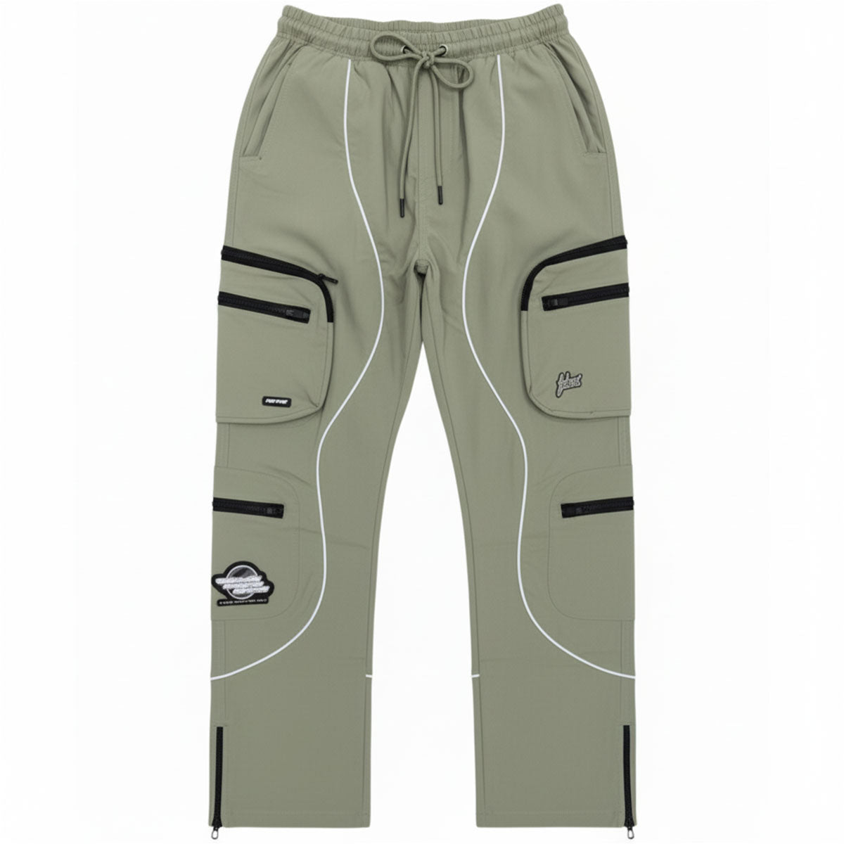 These olive green pants from FSHNS Brand feature a baggy fit with multiple cargo pockets, silicone logo details, reflective piping, rear pockets, and an adjustable drawcord at waist.