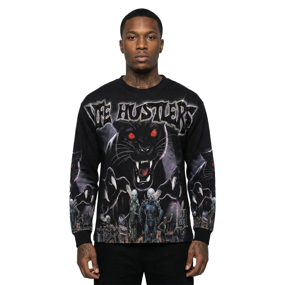 This black long sleeve t-shirt from Life Hustlers features a Black Panther graphic with rhinestone branded details on front, sleeve graphics, and a signature logo rhinestone graphic on rear.