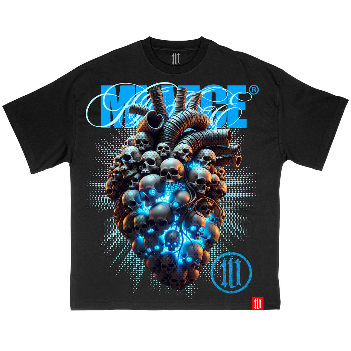 This black t-shirt from Evil Vice features a blue skull heart graphic with branding on front and a large matching logo graphic on rear.