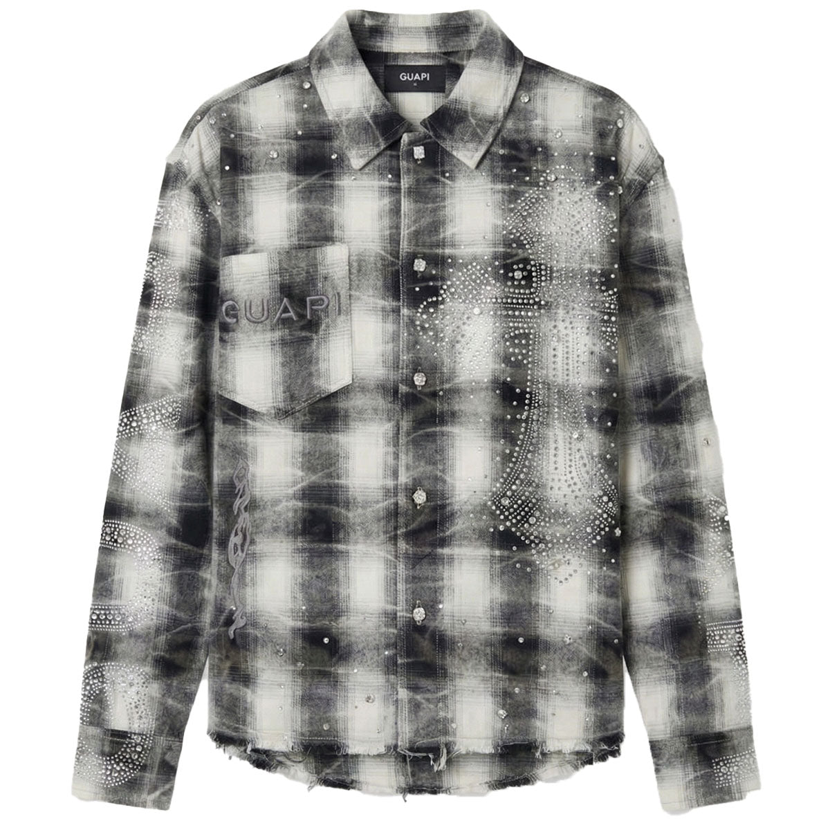 This cloud grey and off-white plaid brushed flannel from Guapi features a crystal-embellished cross and paisley motif on the front chest, embroidered GUAPI branding on the chest pocket flap, and gothic trims along the torso. It includes a large white cross logo appliqué on the rear, which is outlined with clear crystals, and custom silver metal buttons with inset rhinestone detail. The piece is finished with scatter rhinestones on the shoulders, collar, and cuffs, and has a distressed finish with a raw-edge hem.