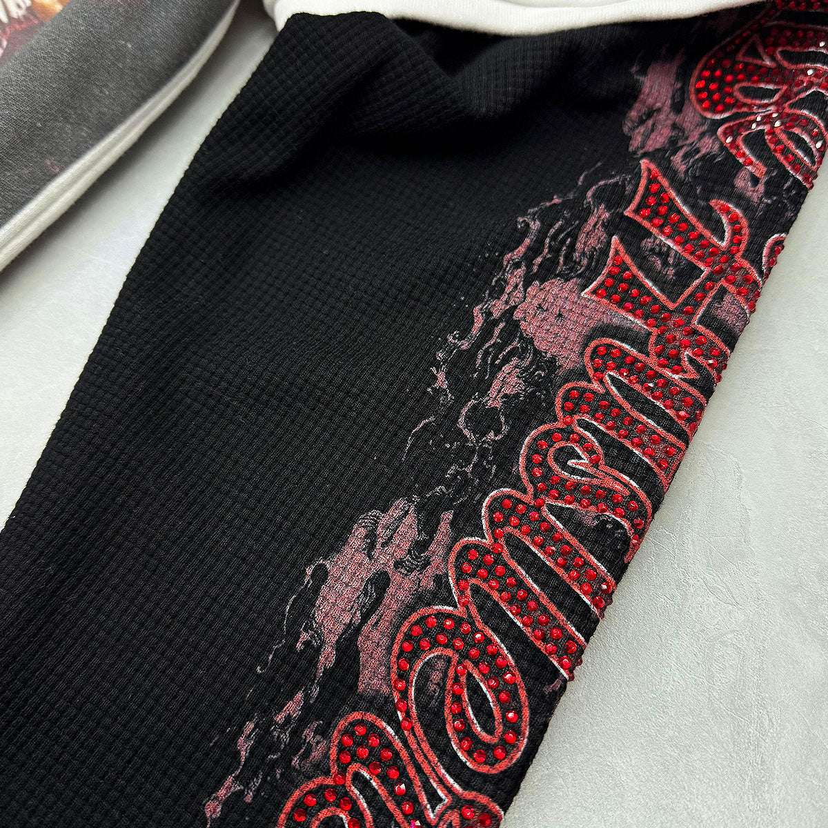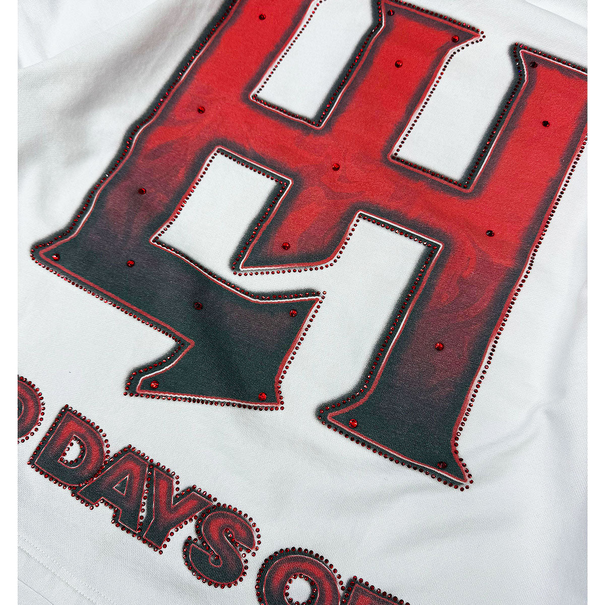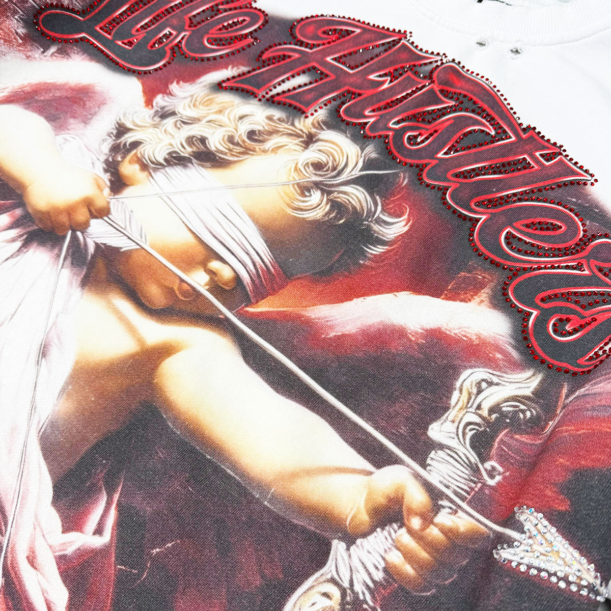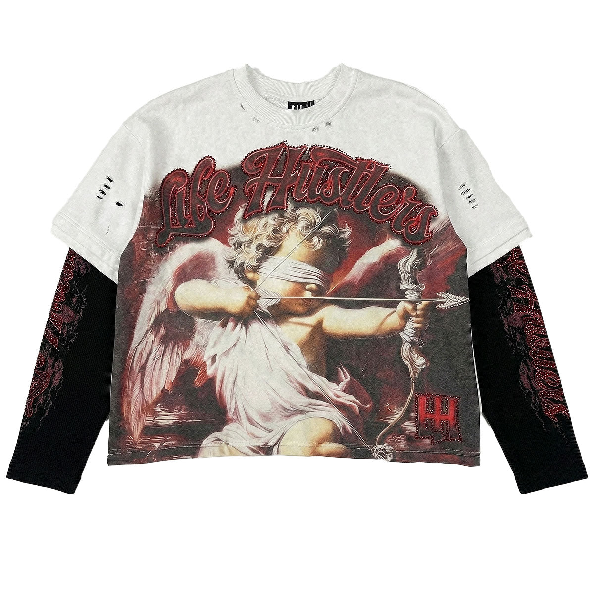 This white long sleeve t-shirt from Life Hustlers features a blindfolded arrow angel graphic on front with multiple rhinestone details and a monogram logo graphic on rear.
