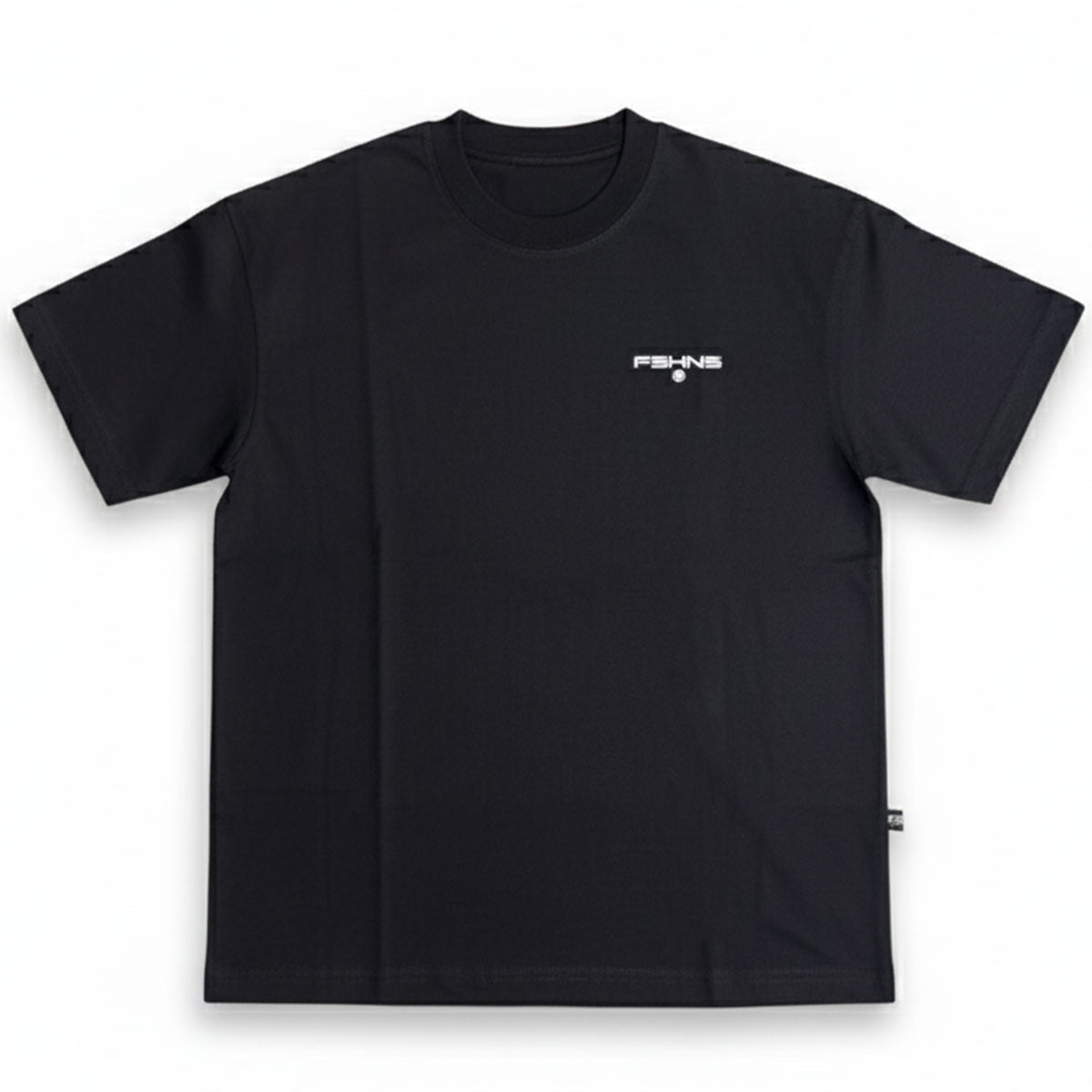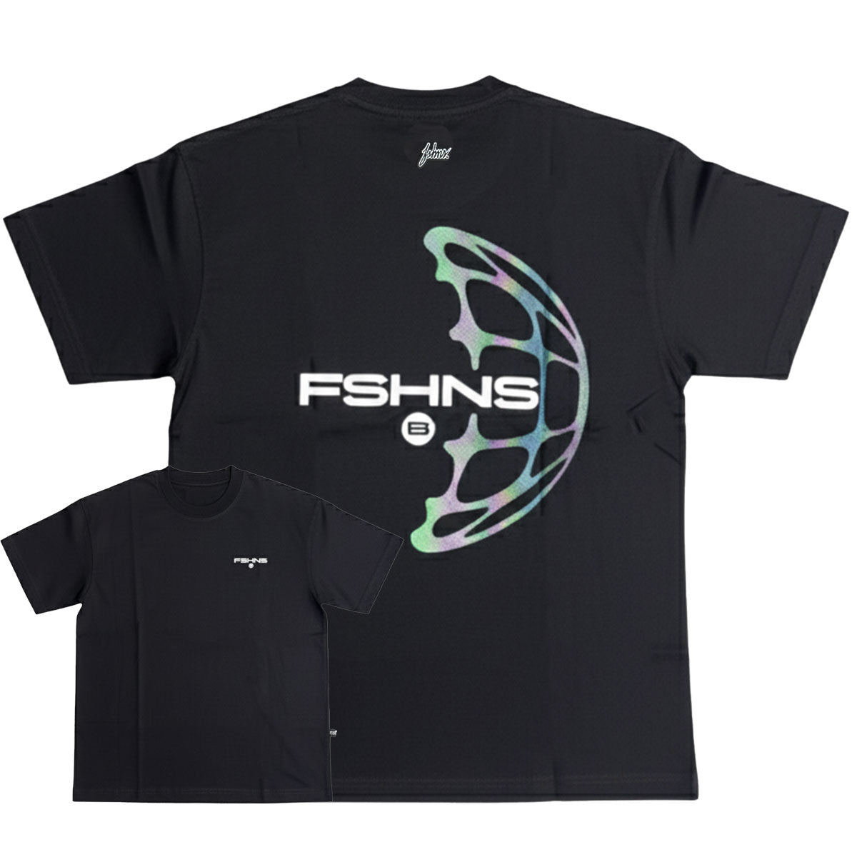 This black t-shirt from FSHNS Brand features a small branded logo on front and a large iridescent globe graphic with a silicone logo patch.