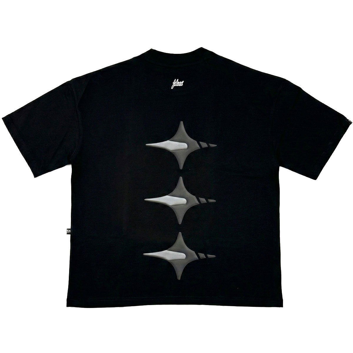 This black t-shirt from FSHNS Brand features a small grey star graphic on front and a matching repeated Astro Space star graphic with a silicone logo patch on rear.