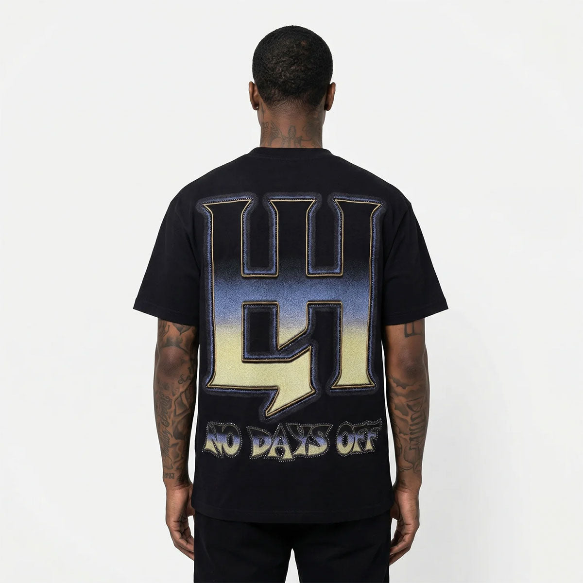 This black t-shirt from Life Hustlers features an alien city graphic with branded rhinestone details on front and a matching signature rhinestone logo graphic on rear.