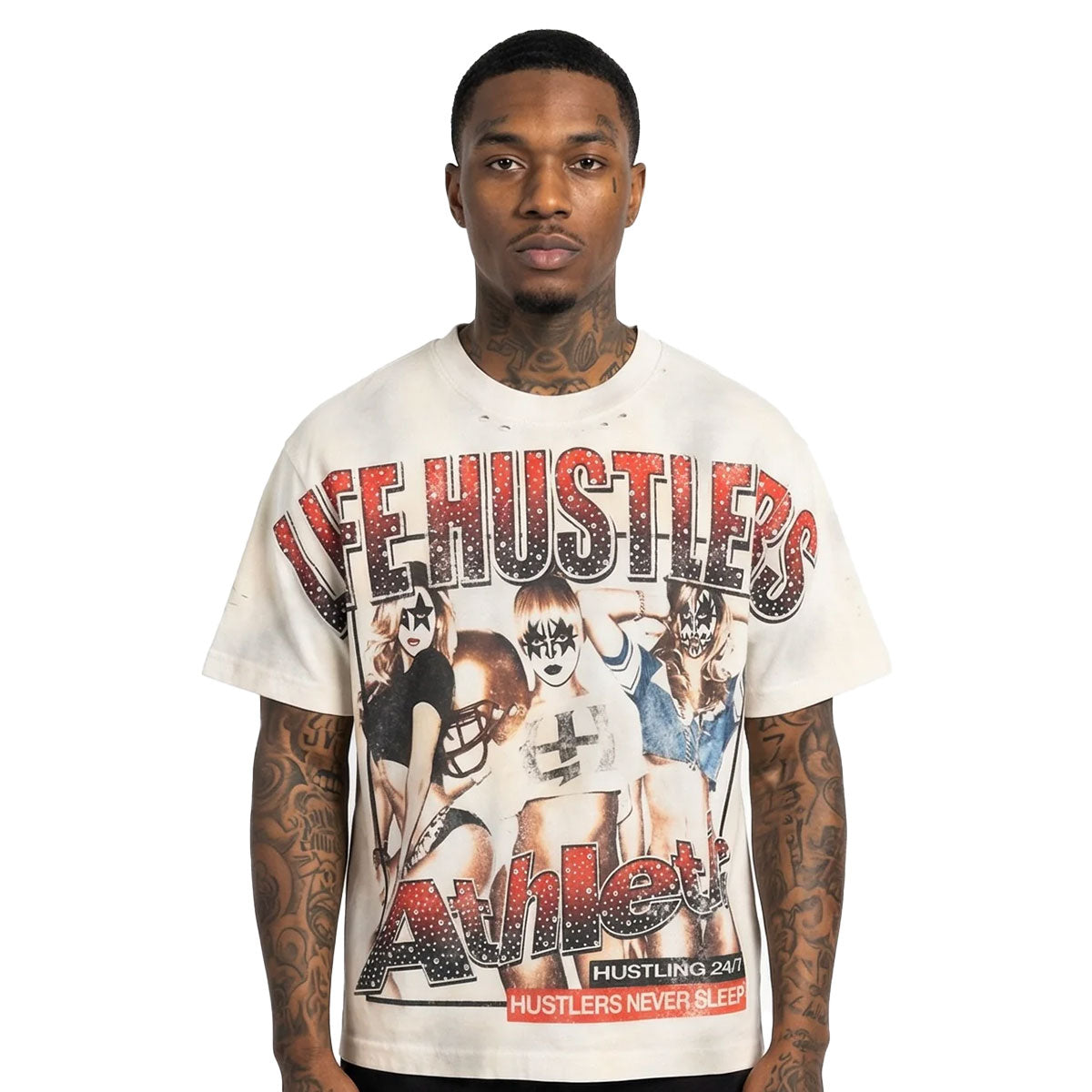 This cream t-shirt from Life Hustlers features an Football Girl club graphic with branded rhinestone details on front and a matching signature rhinestone logo slogan graphic on rear.