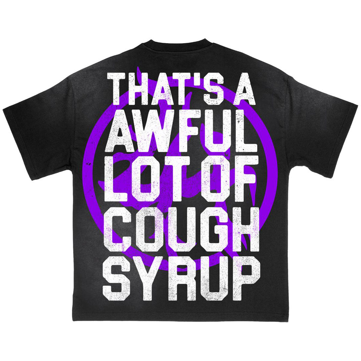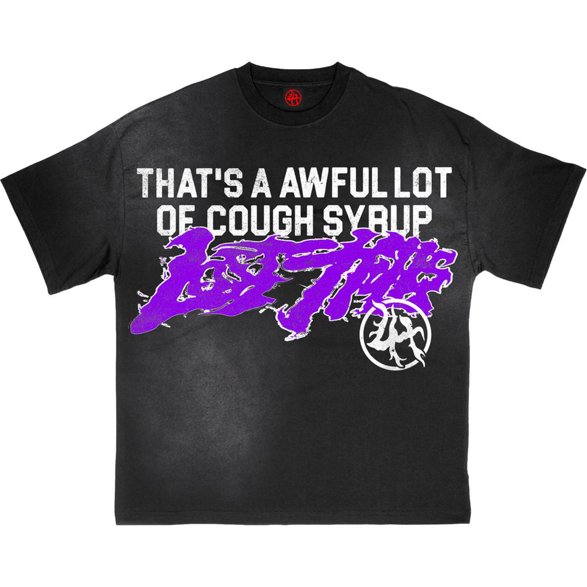 This black t-shirt made in collaboration by LOSTHILLS and That's a Awful Lot of Cough Syrup features a branded collab graphic with on front and a matching graphic on rear.