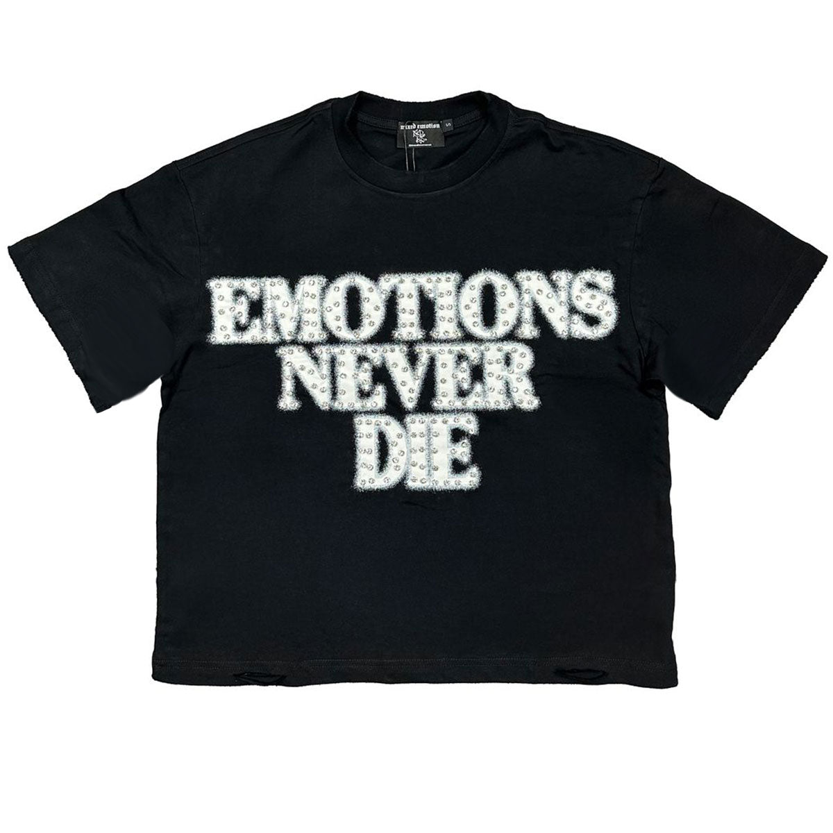 This black t-shirt from Mixed Emotion features an 'Emotions Never Die' graphic with rhinestone details on front and a matching branded graphic on rear.