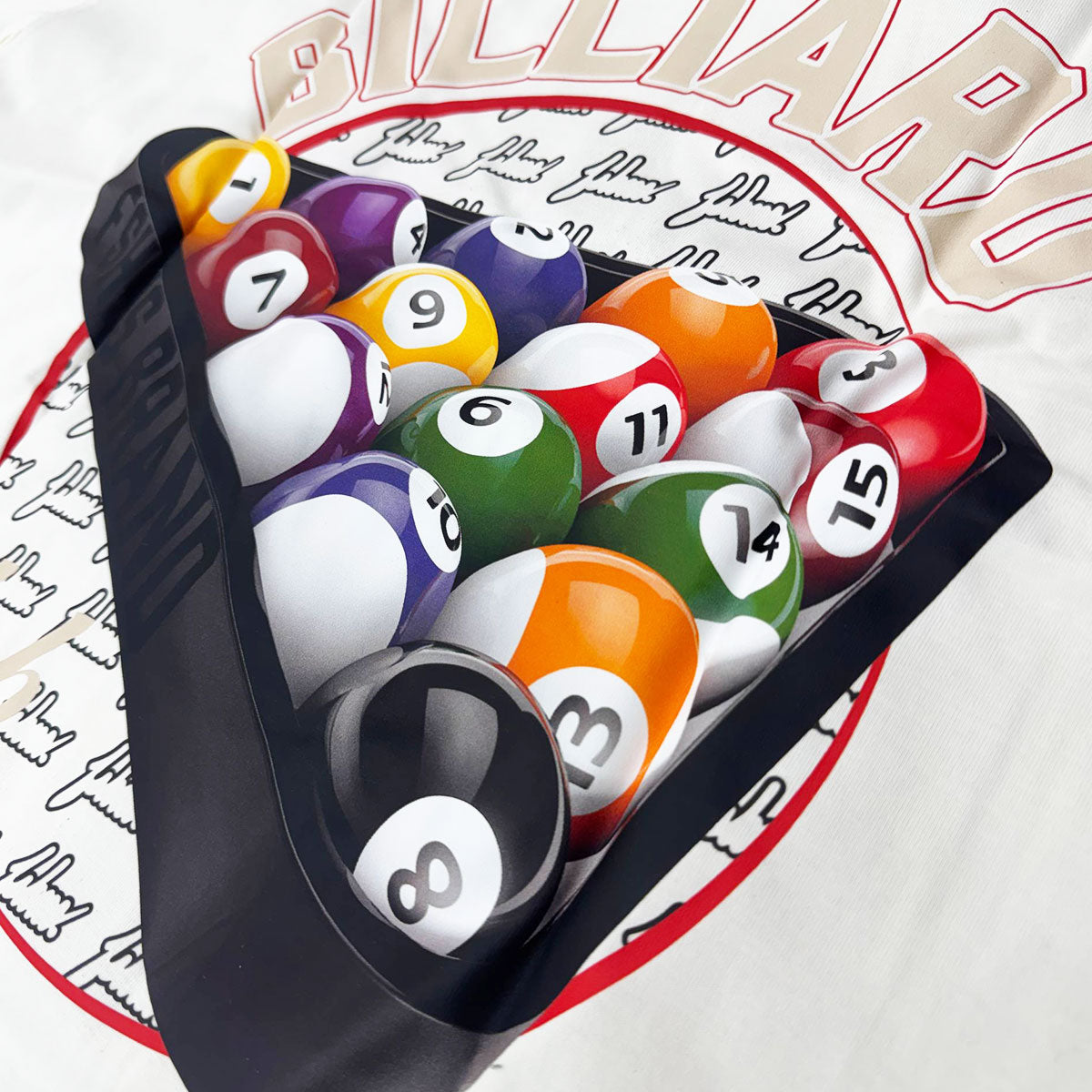 This vanilla cream oversize t-shirt from FSHNS Brand features a billiard club branded graphic on front and a billiard triangle graphic on rear.