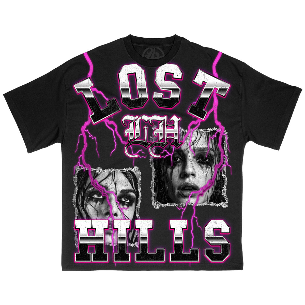 This black t-shirt from LOSTHILLS features a purple lightning portrait graphic with branding on front and a large matching 'Pain' logo graphic on rear.