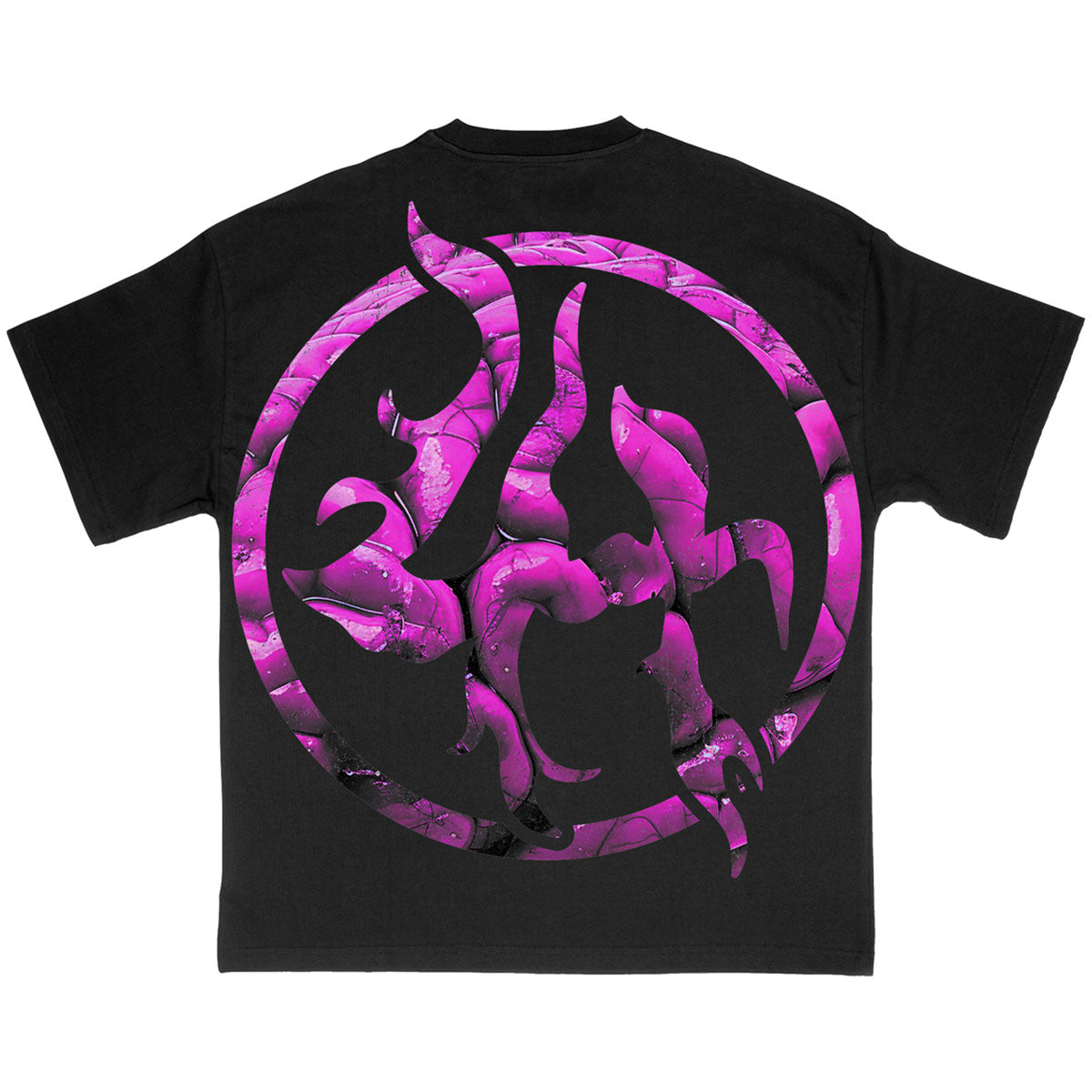 This black t-shirt from LOSTHILLS features a spiked skull brain graphic with branding on front and a large matching purple logo graphic on rear.