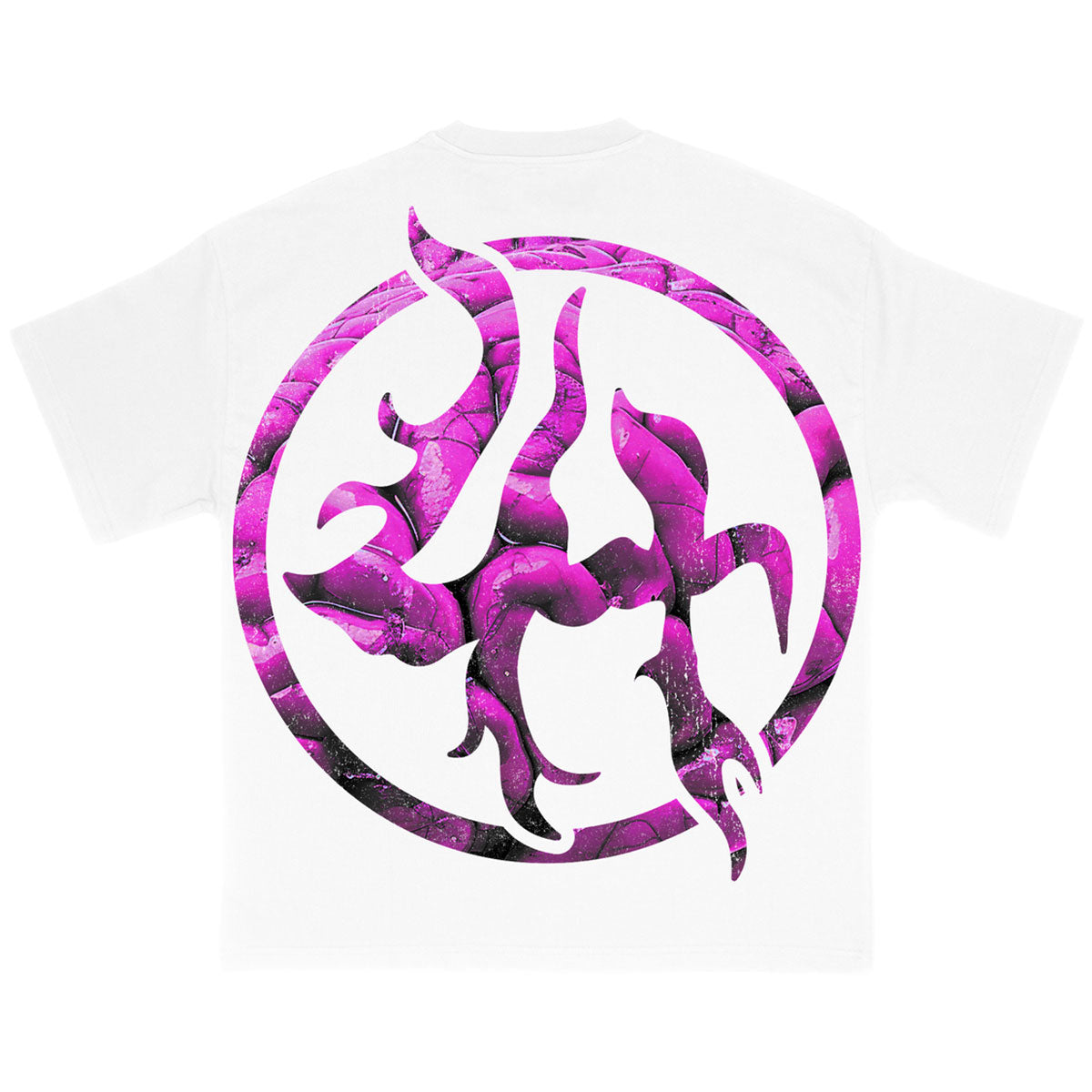 This white t-shirt from LOSTHILLS features a spiked skull brain graphic with branding on front and a large matching purple logo graphic on rear.
