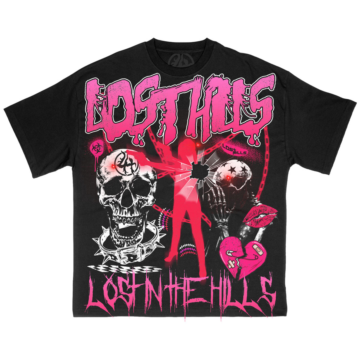 This black t-shirt from LOSTHILLS features a pink hear skull shot graphic with branding on front and a large matching heart kiss logo graphic on rear.