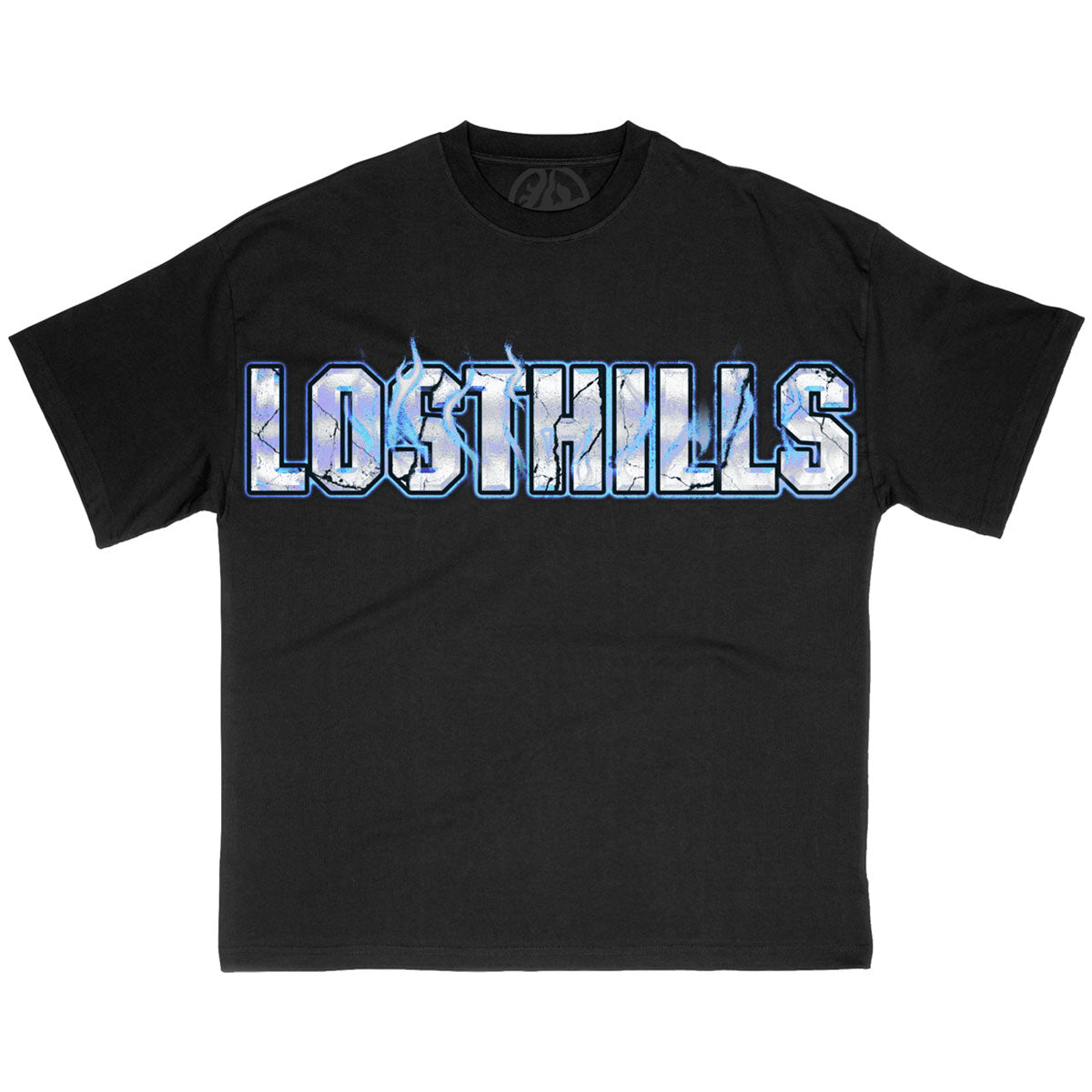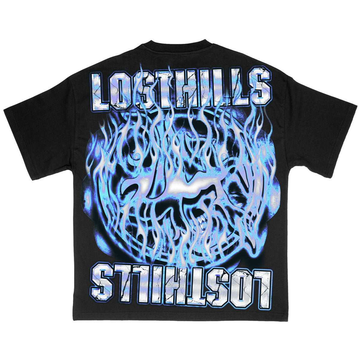 This black t-shirt from LOSTHILLS features a blue flame chrome logo graphic with branding on front and a large blue flaming chrome logo graphic on rear.