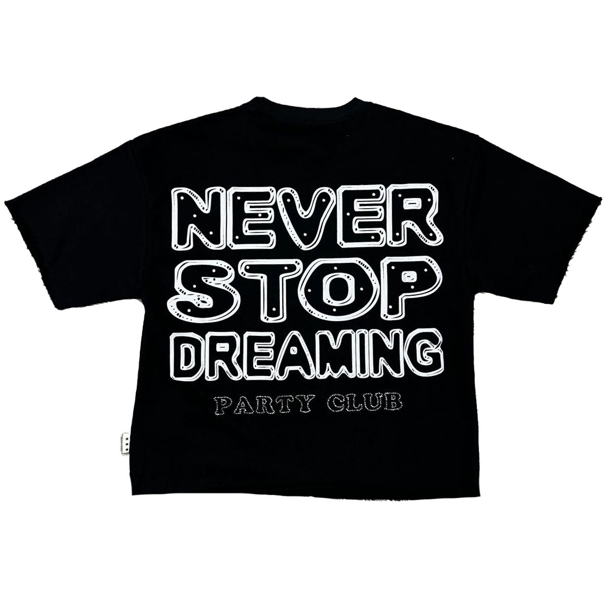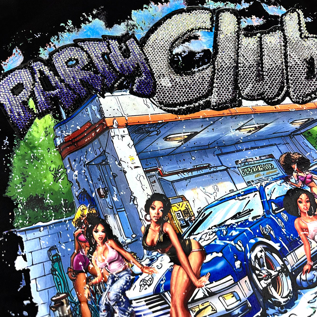 This black t-shirt from BKYS features a rhinestone car club graphic with branding on front and a matching slogan graphic on rear.