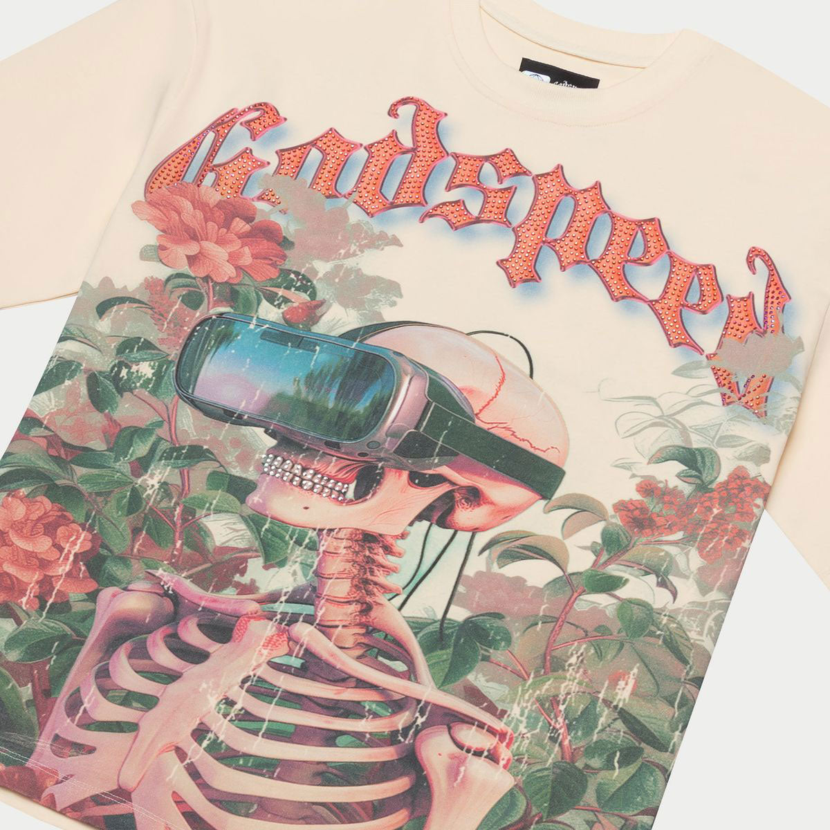 This bone cream t-shirt from Godspeed features a virtual reality goggle helmet skeleton garden graphic with branding on front and a rhinestone detailed slogan graphic on rear.