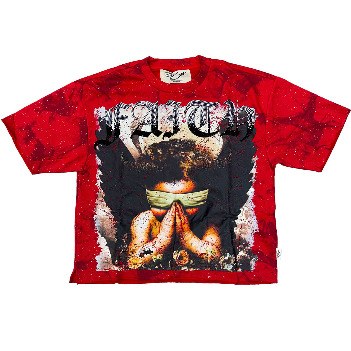 This red t-shirt from BKYS features a grey tie dye design with a praying angel graphic, a distressed look, and extensive rhinestone details on front paired with multiple graphics in rhinestones on rear.