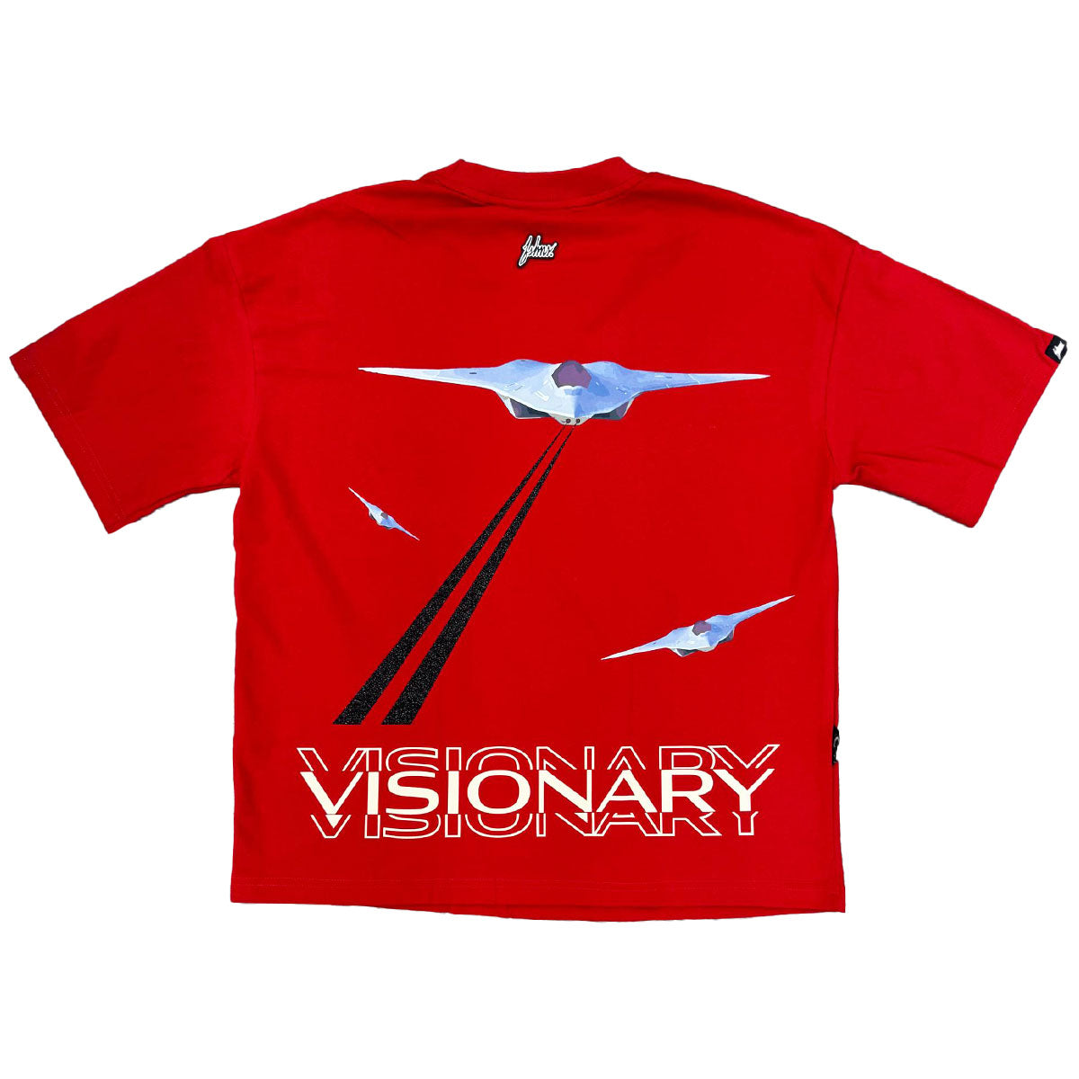 This red t-shirt from FSHNS Brand features a Visionary F-35 graphic on front and a matching large graphic with a small silicone logo patch on rear.