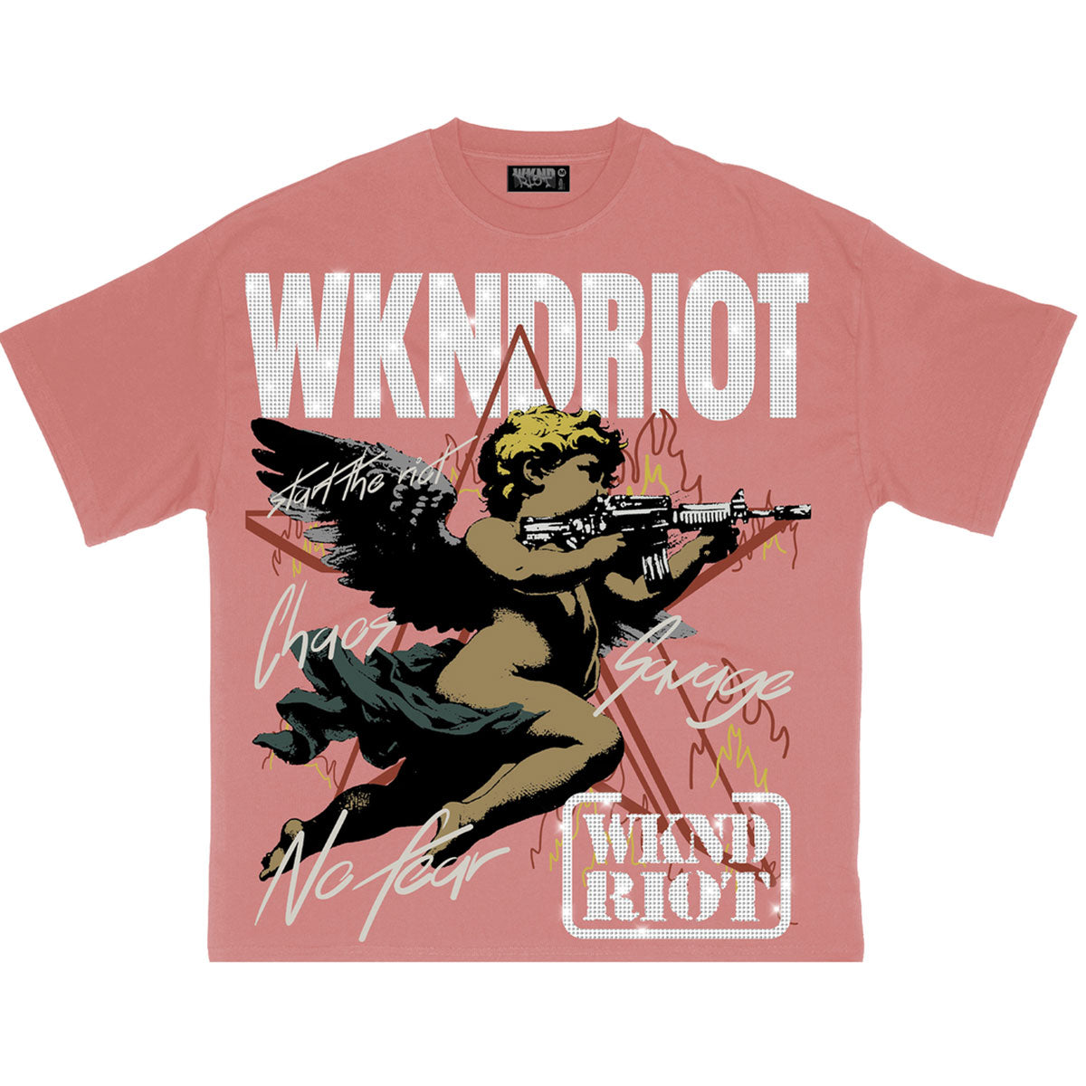This peach t-shirt from WKND RIOT features a large angel graphic on front with rhinestone branded graphics on both sides.