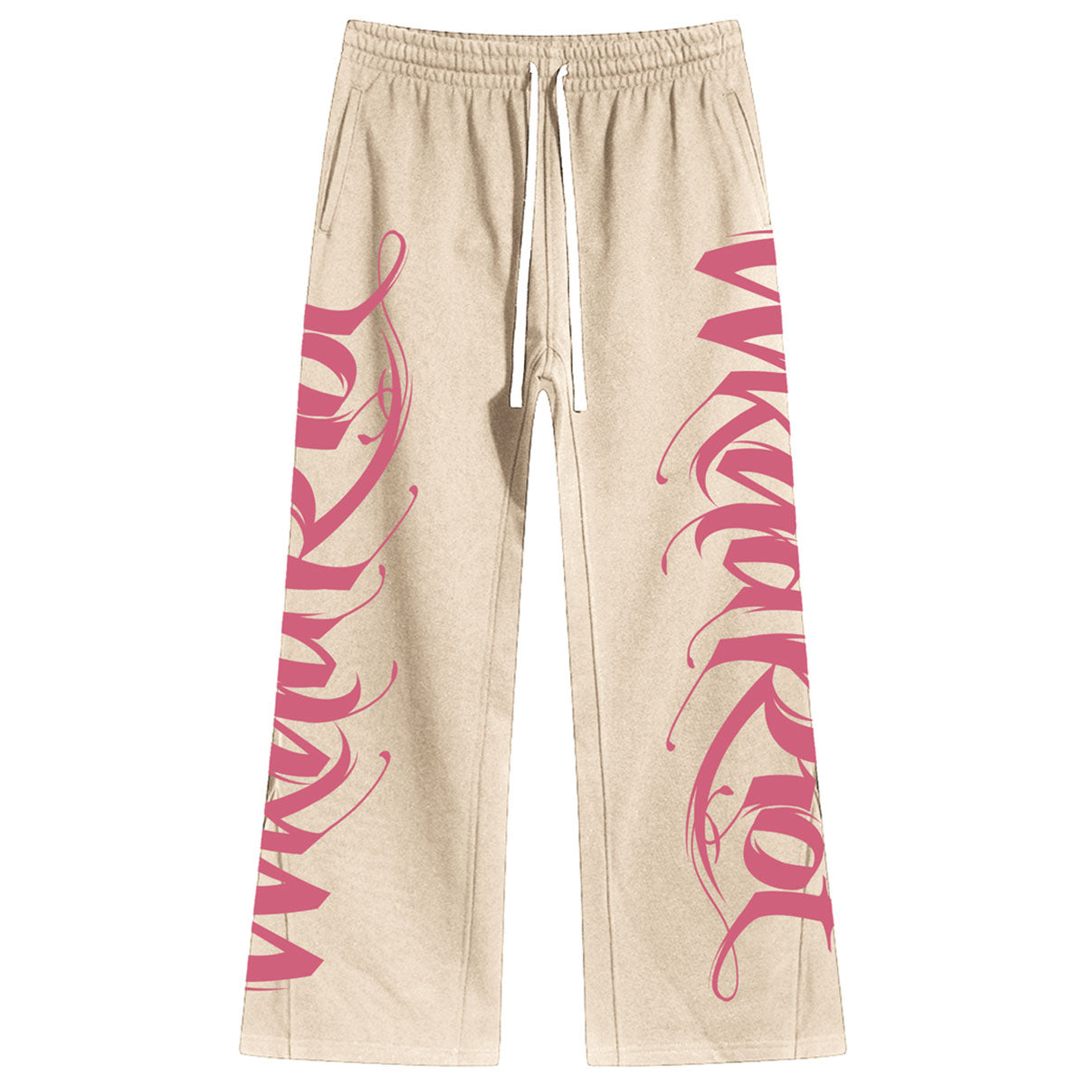 These cream sweatpants from WKND RIOT feature pink branded graphics on both sides and an adjustable drawcord at waist.