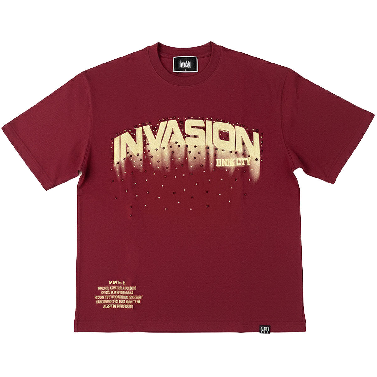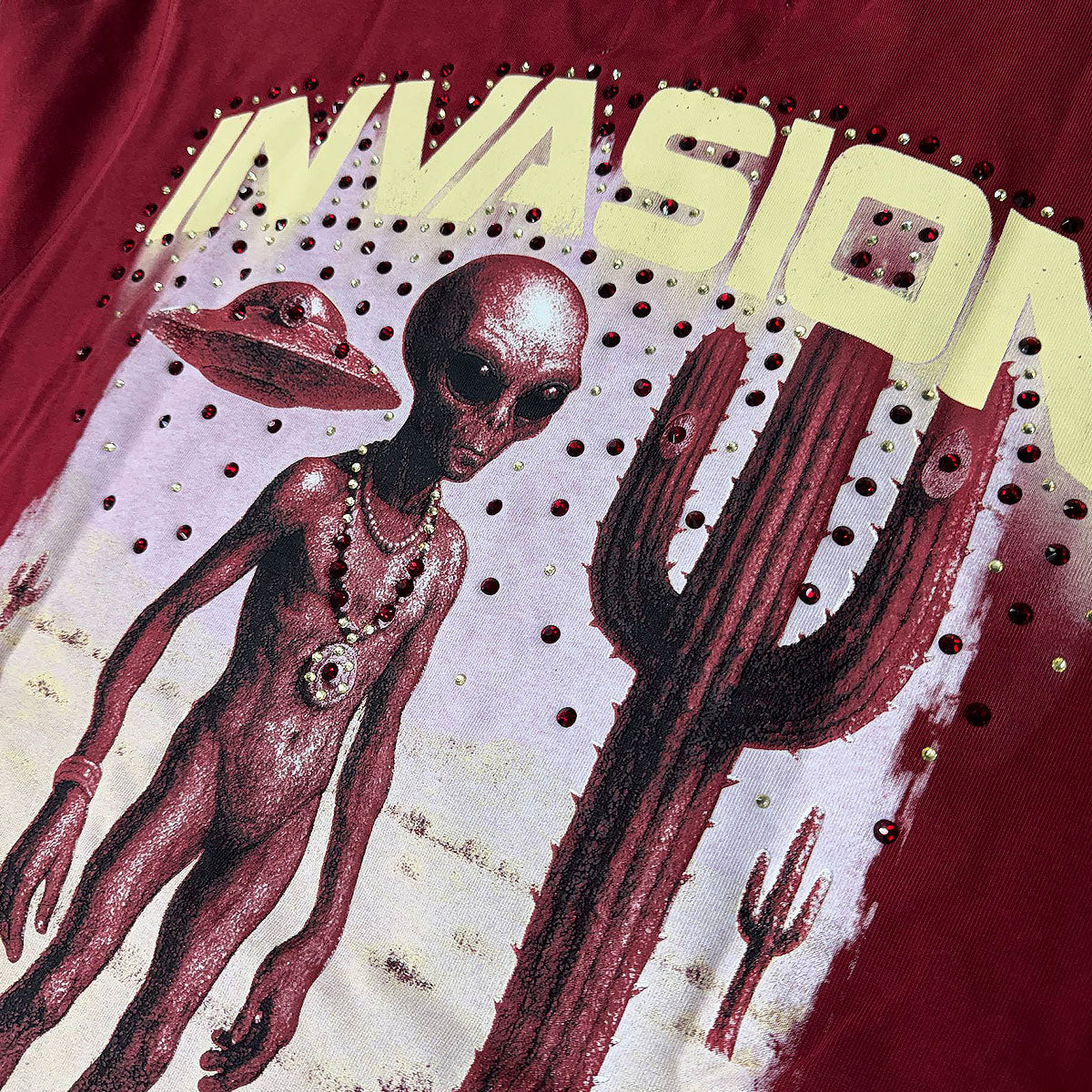 This burgundy t-shirt from Denimicity features a cream and silver large rhinestone 'Invasion' slogan on front and a large matching alien cactus graphic on rear.
