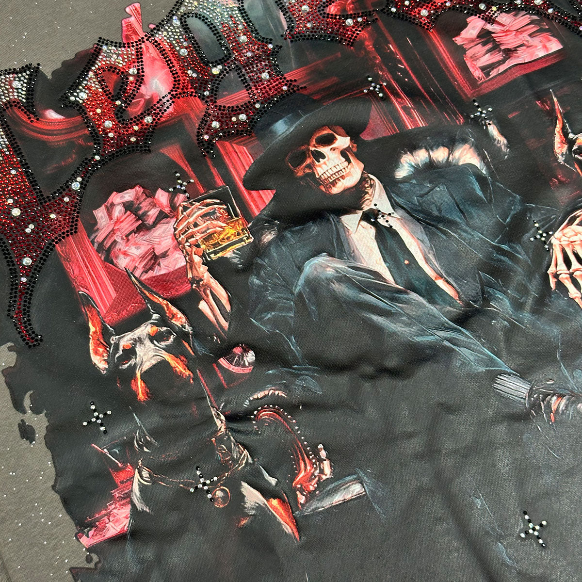 This grey t-shirt from BKYS features a rhinestone capo skeleton dog graphic with branding on front and a matching slogan graphic on rear.