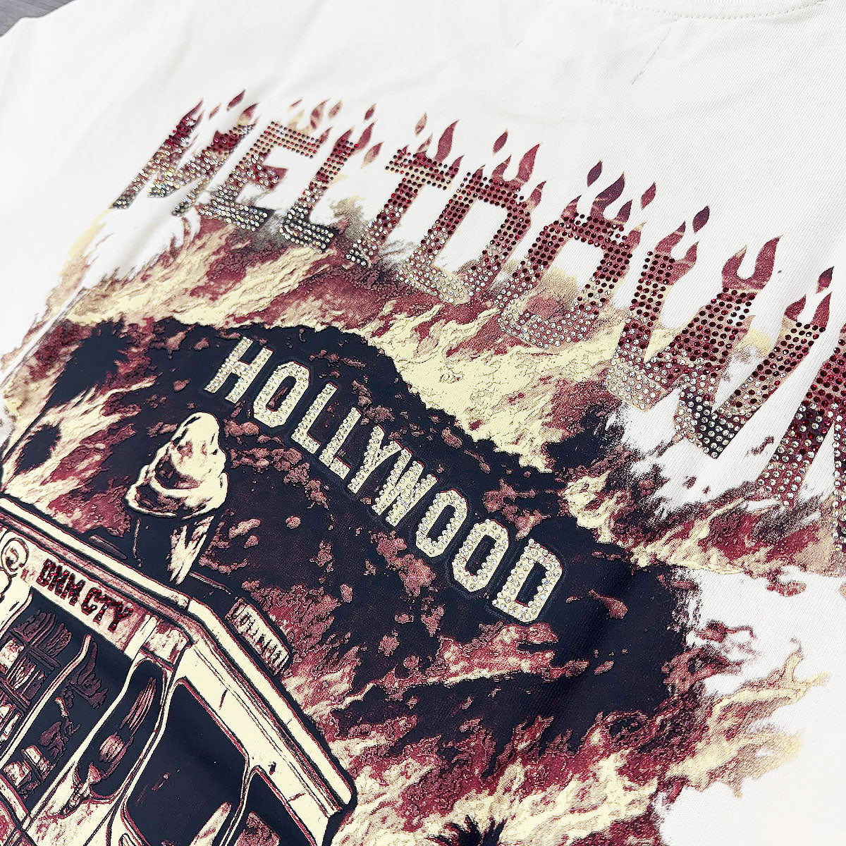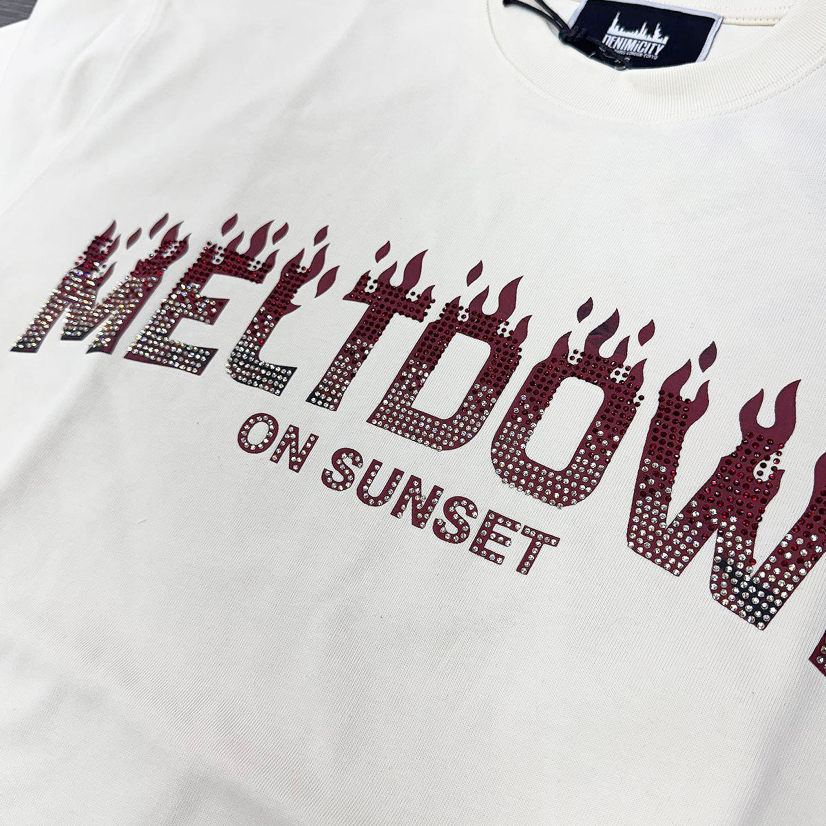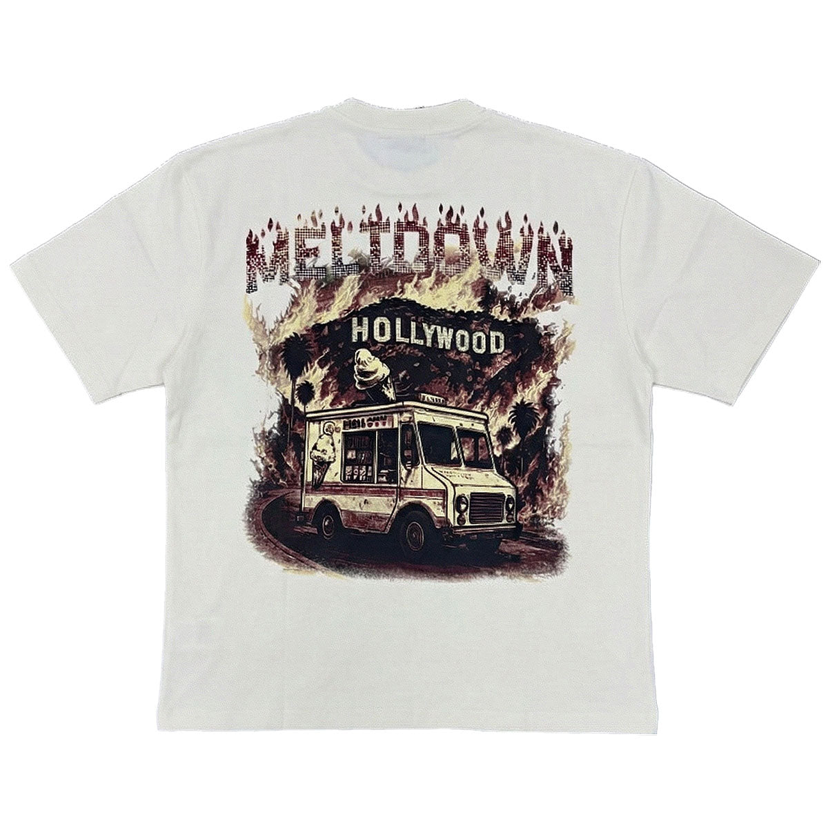 This natural cream t-shirt from Denimicity features a burgundy rhinestone Meltdown graphic with branding on front and a melting Hollywood ice cream truck graphic on rear.