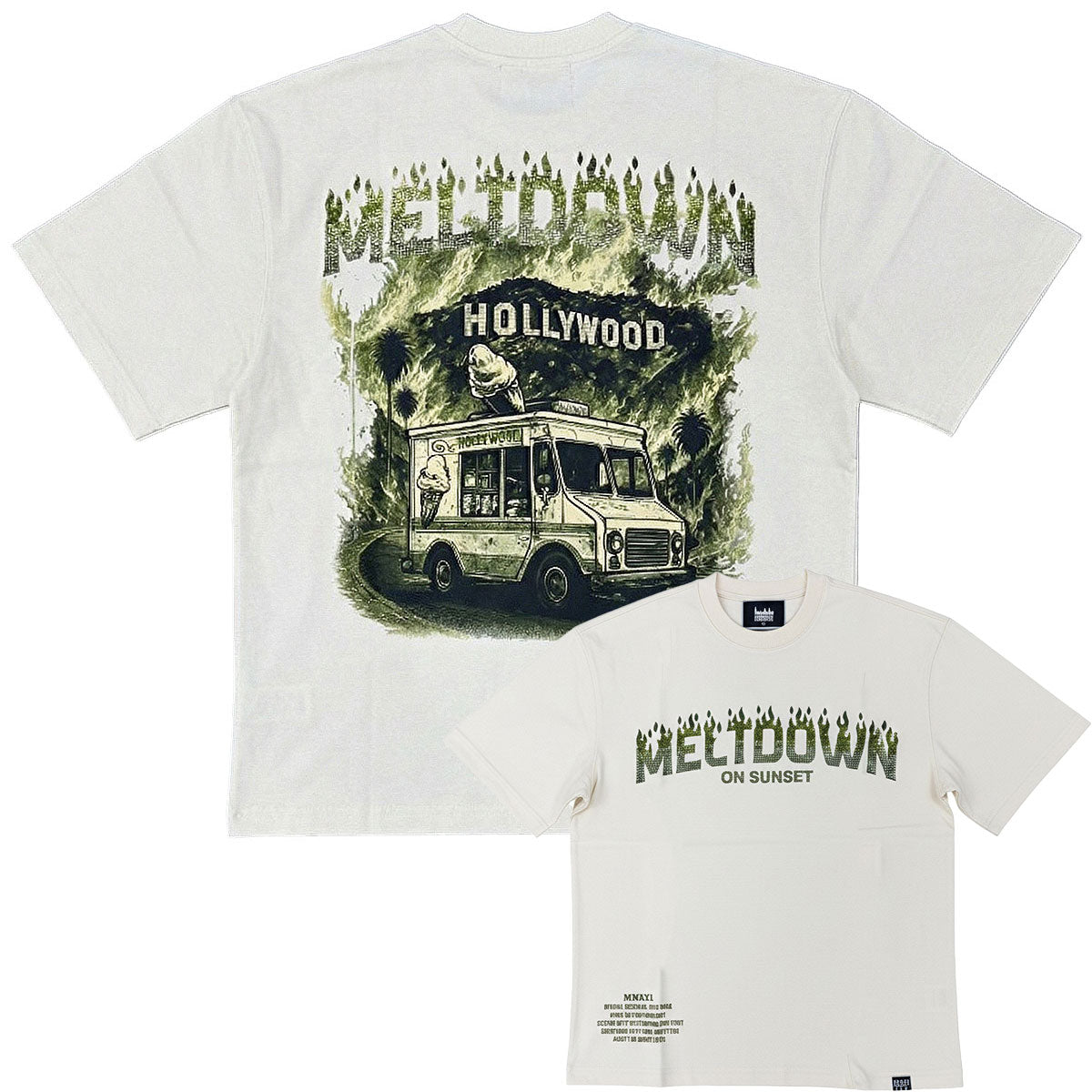 This natural cream t-shirt from Denimicity features a moss green rhinestone Meltdown graphic with branding on front and a melting Hollywood ice cream truck graphic on rear.