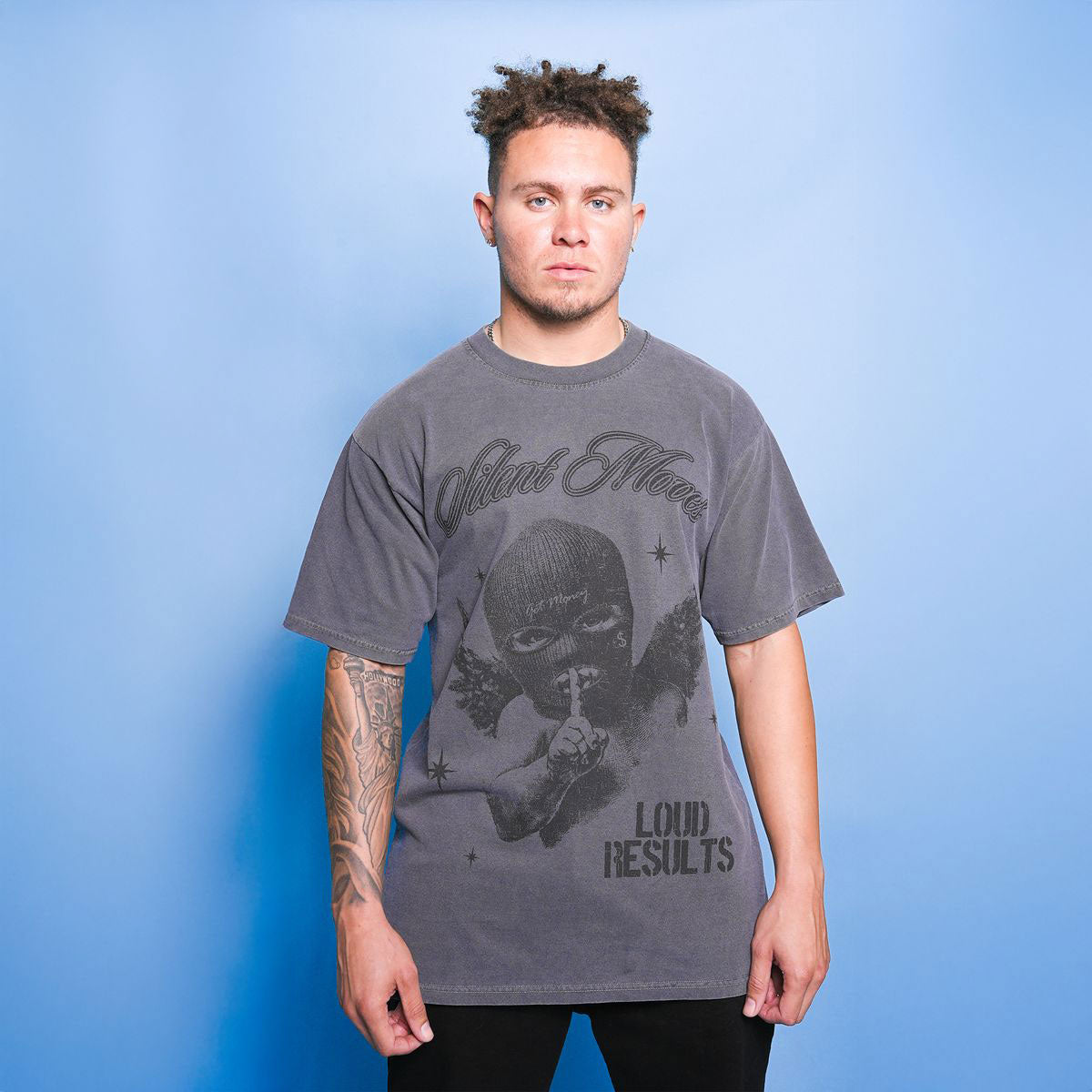 This black pigment t-shirt from Hasta Muerte features a large ski mask angel graphic with branding on front and a custom AK hangtag.