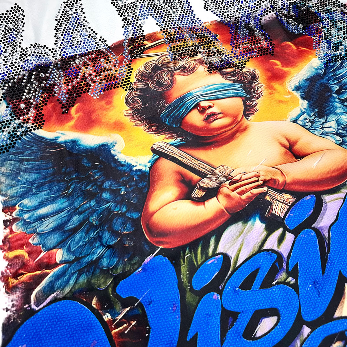 This white t-shirt from BKYS features a rhinestone blind angel slogan graphic with a large slogan graphic on rear.