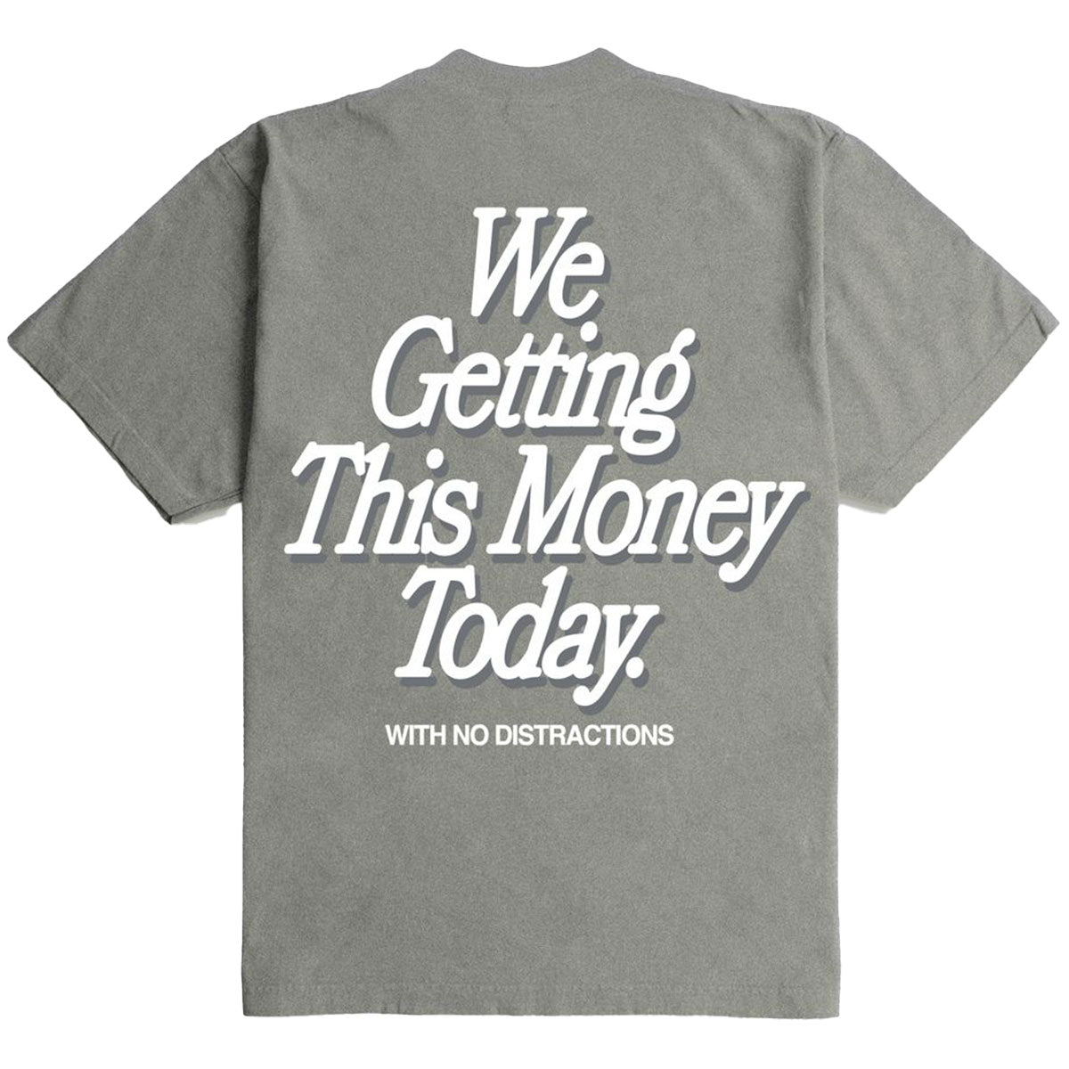 This cement grey t-shirt from Outrank features a branded graphic on front with a large 'Getting This Money' slogan graphic on rear.