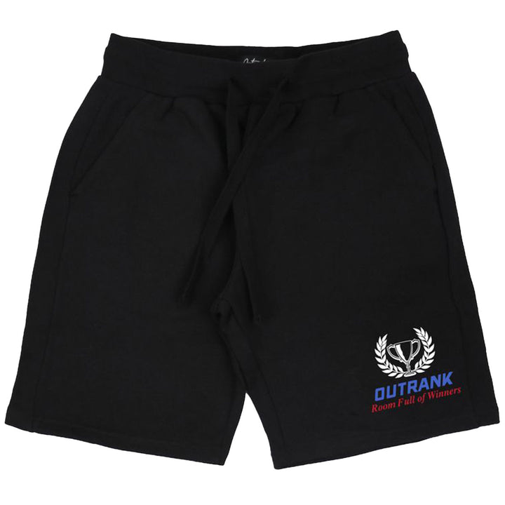 These black fleece shorts from Outrank feature a trophy brand embroidery on front, ribbed waistband, flat drawcords, side pockets, 1 back pocket, and a 9" inseam.