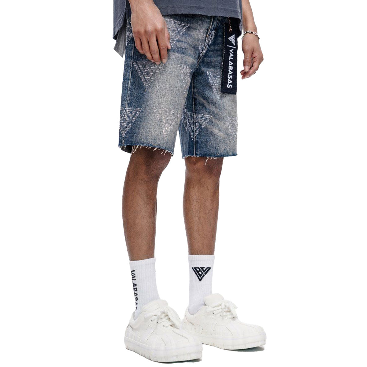 These regular rise dark wash jean shorts from Valabasas feature multiple pyramid rhinestone details, a washed look,